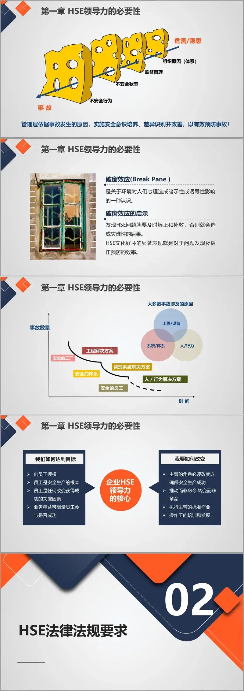 日常 HSE 管理必知部分,涵盖目标指标设定与绩效考核,强调目标需符合明确性、可衡量等原则,需层层分解与考核。详细讲解了风险预防管理,包括危险源辨识、风险评价的方法与流程,分类列出物理性、化学性等危害因素,提出消除、替代、工程控制等风险控制措施。同时,强调员工 HSE 培训的重要性,明确培训时机、内容与衡量标准,介绍了行为安全观察、挂牌上锁、变更管理等实用管理工具与方法,以及 HSE 审核检查的类别、重点与整改原则,还有应急响应管理与事故调查处理的流程、原则与技巧。