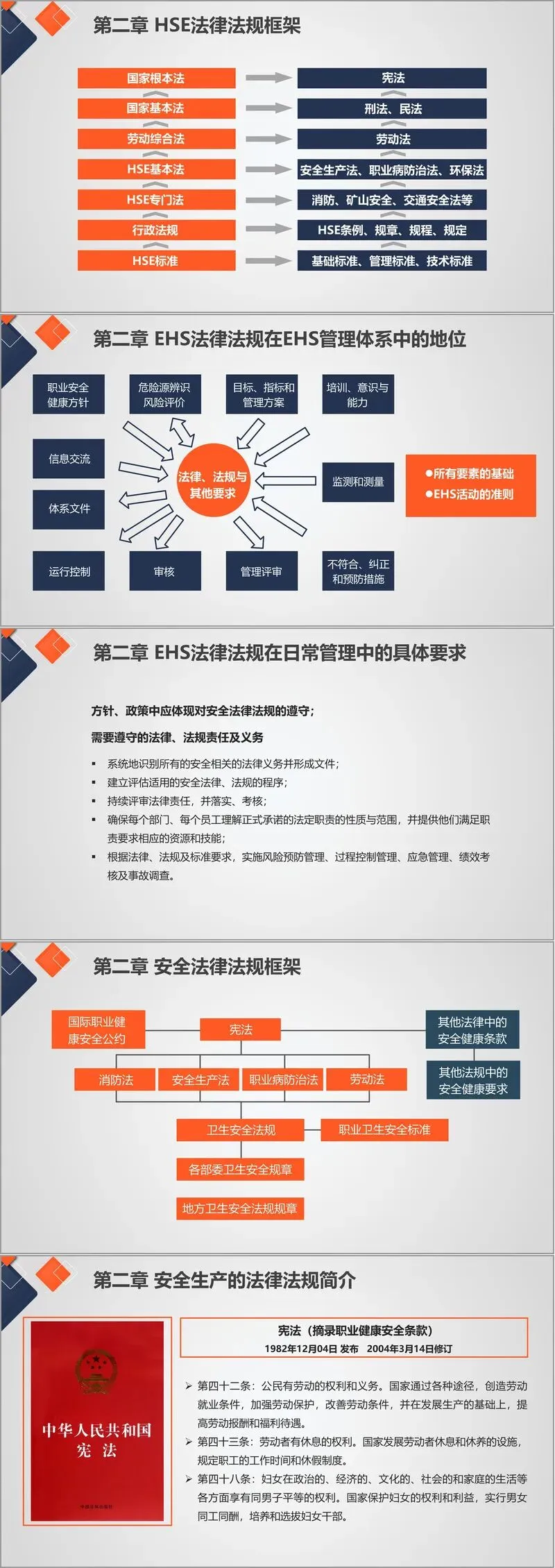 在 HSE 法律法规要求部分,梳理了从宪法到具体标准的完整法规体系,详解了宪法、刑法、安全生产法、环境保护法等核心法律的相关条款与要求。明确生产经营单位的 12 项主体责任,以及安全生产法的方针、机制与理念,强调企业需严格遵守法律法规,落实风险预防、过程控制、应急管理等工作,同时介绍了新项目在环保、安全、职业健康方面的 “三同时” 管理流程与要求。