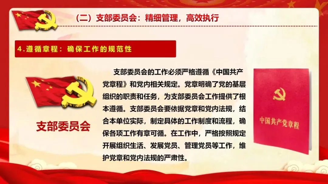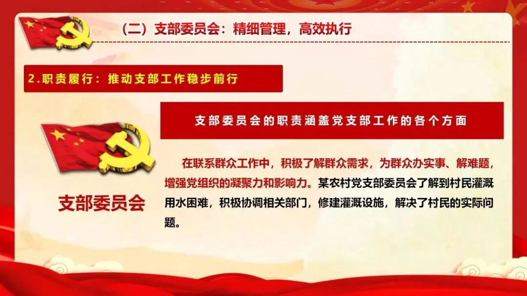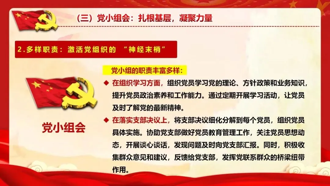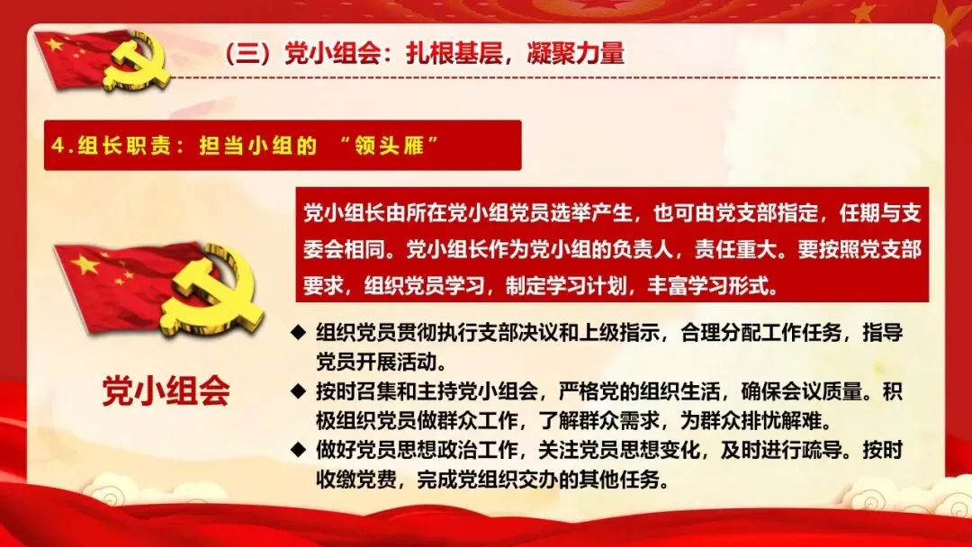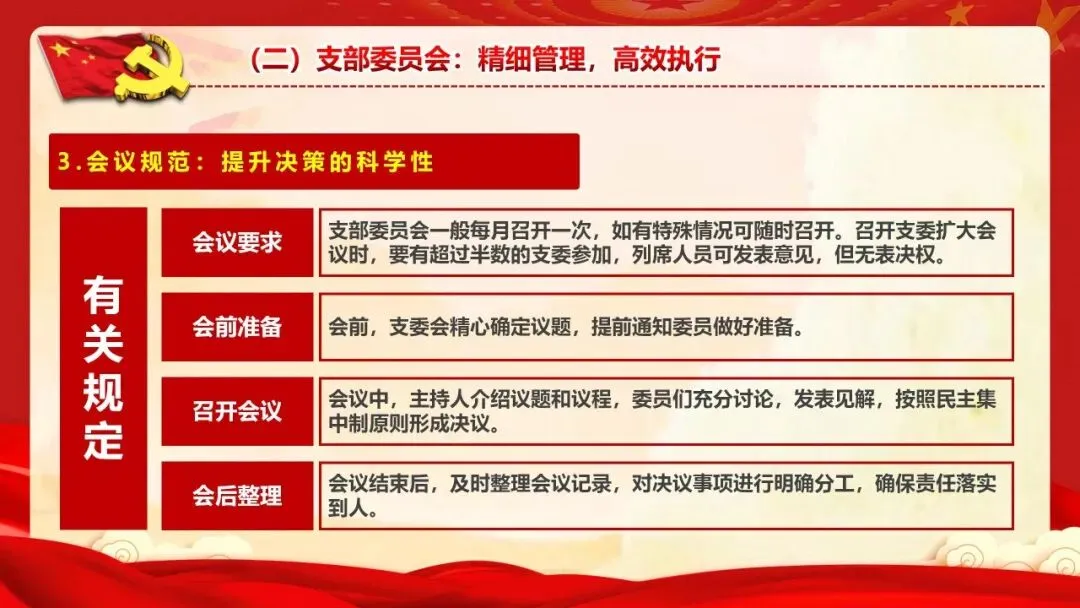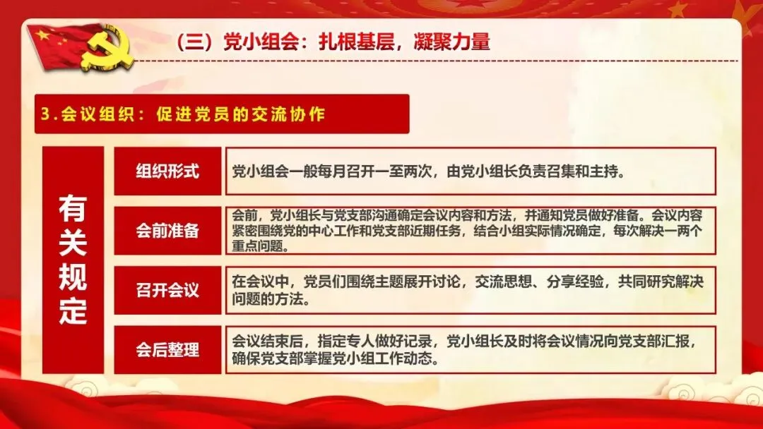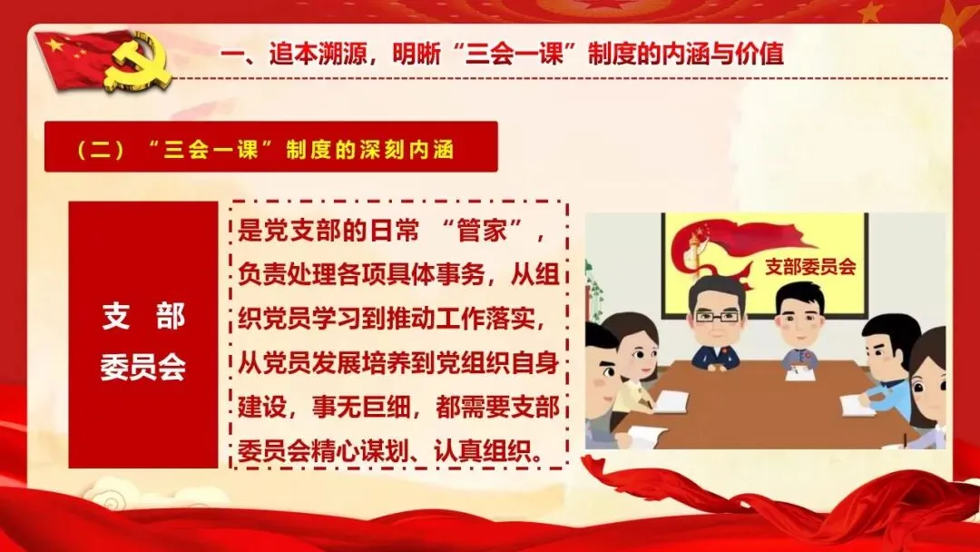 “三会一课”不是形式主义,是基层党建的红色引擎!支部党员大会定方向、支委会抓落实、党小组促落地、党课强党性,四者环环相扣。从会议流程到参会要求,从职责分工到内容创新,每一项都有明确规范。摒弃枯燥说教,结合工作实际创新形式,让组织生活有温度、有实效,既能凝聚党员力量,又能破解基层难题,激活党建活力。