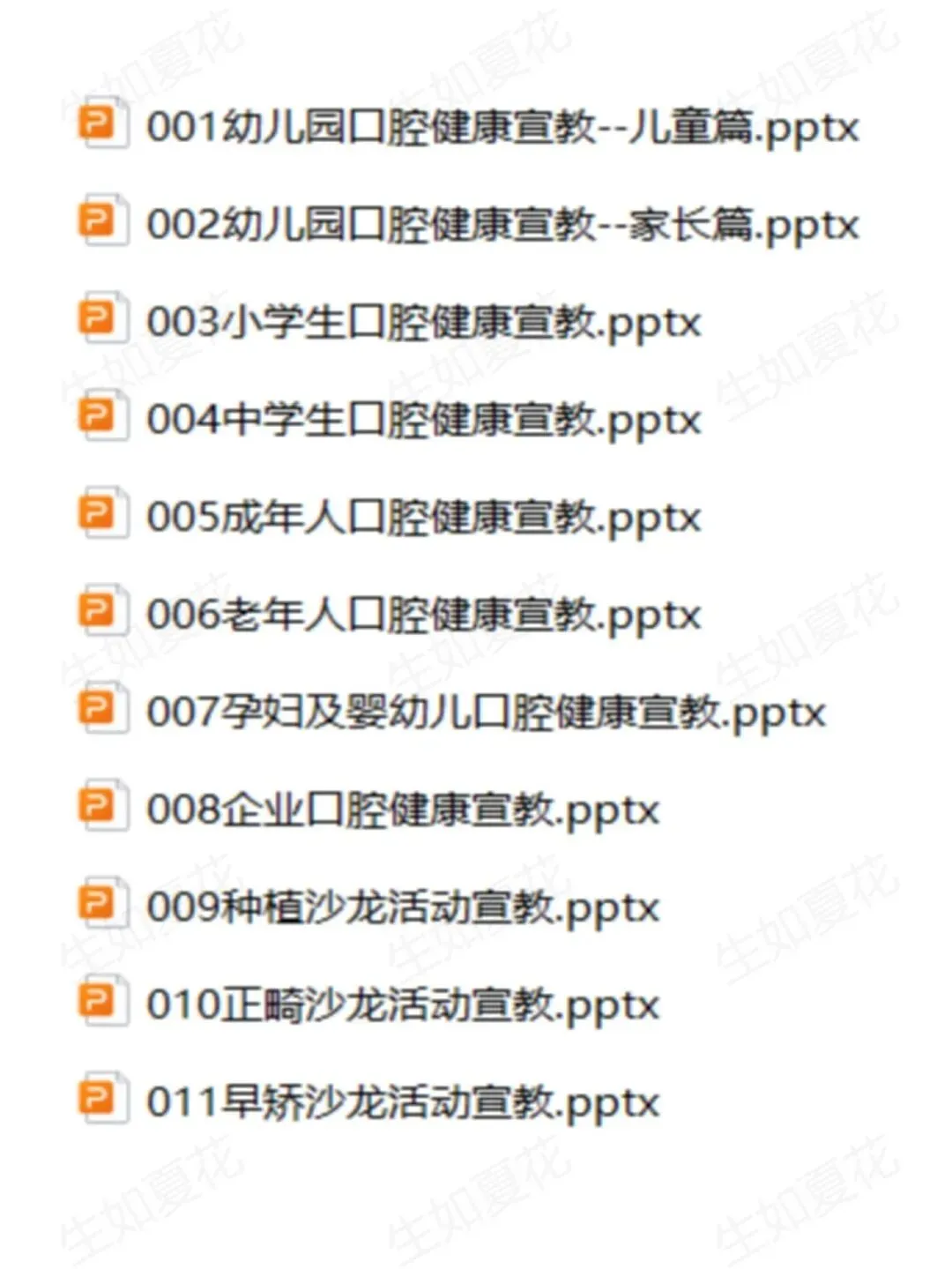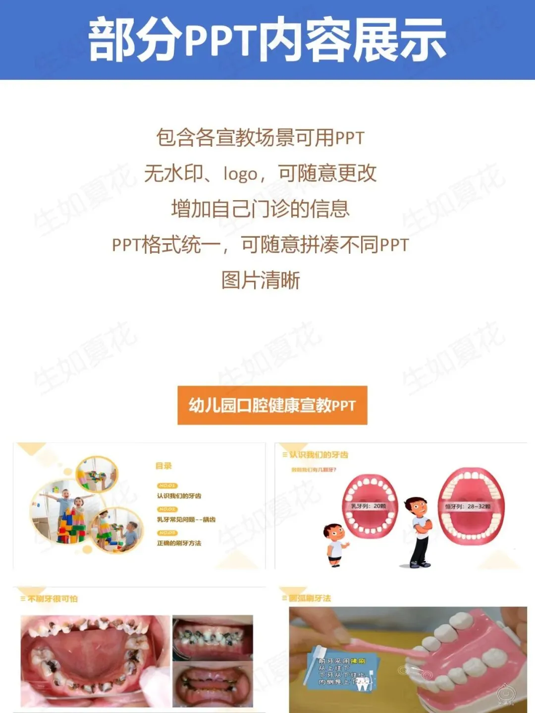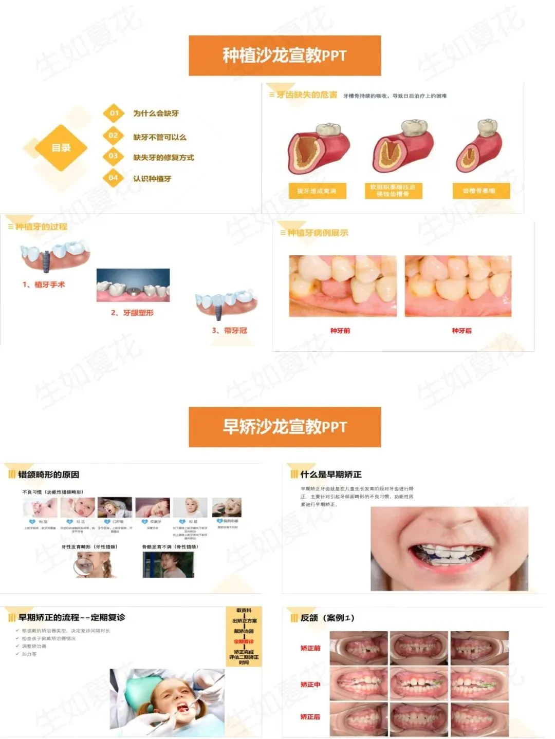 我根据不同年龄层、不同受众的心理特点和常见口腔疾病,定制了差异化的PPT内容,每一页都为“成交”与“科普”而生。