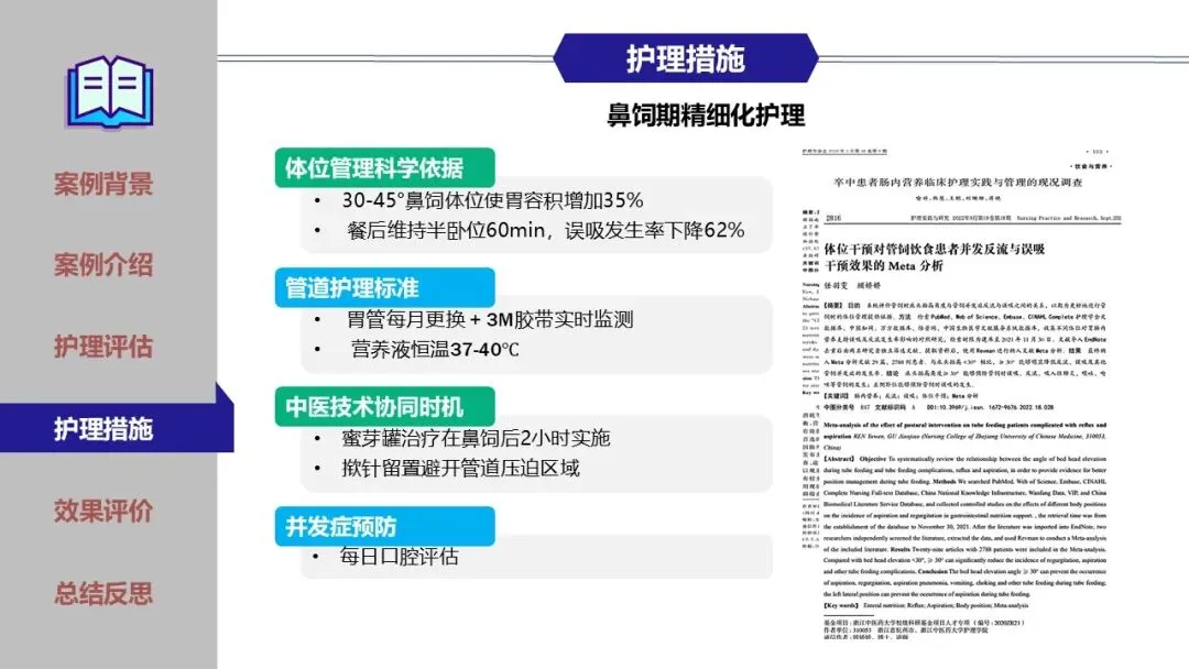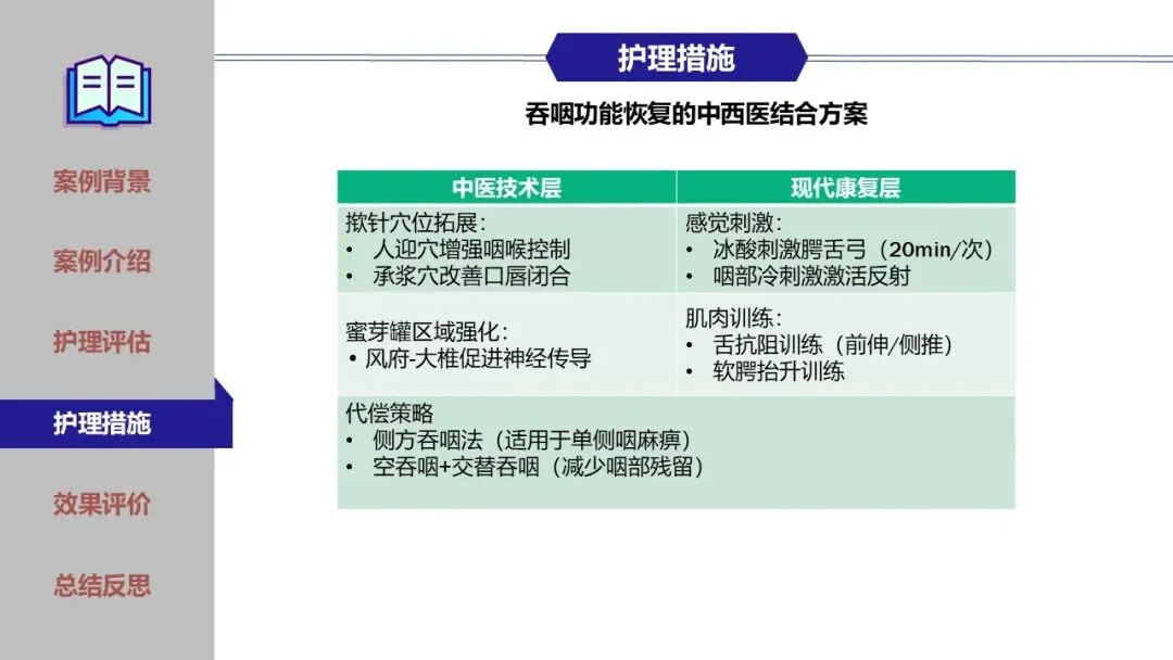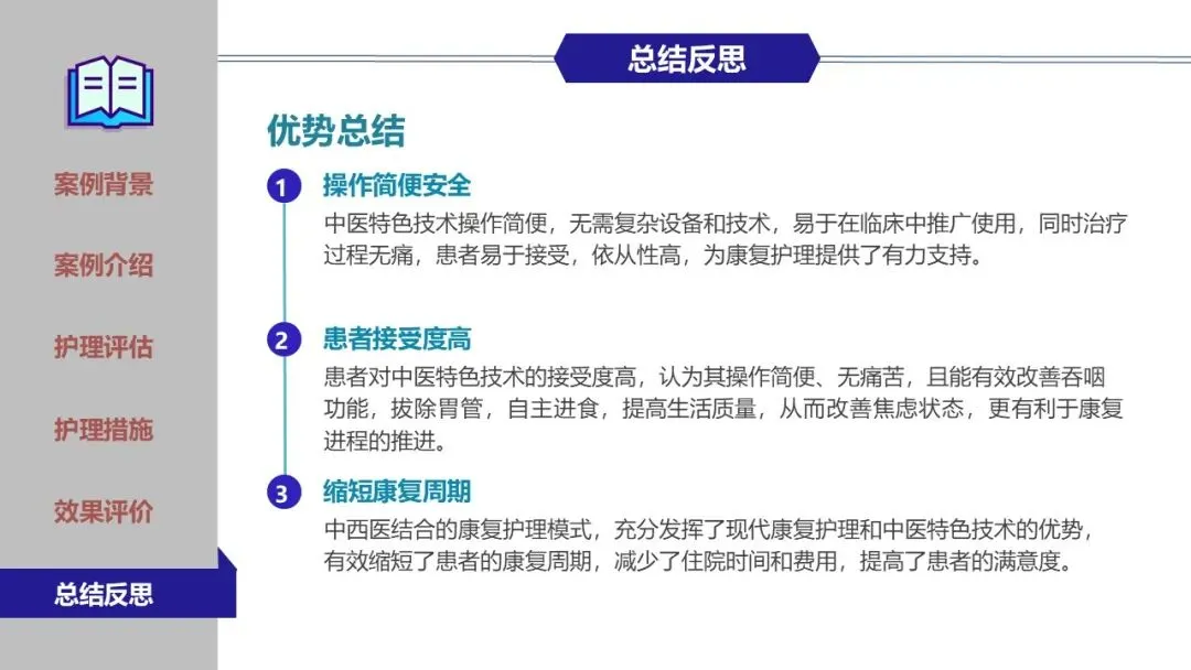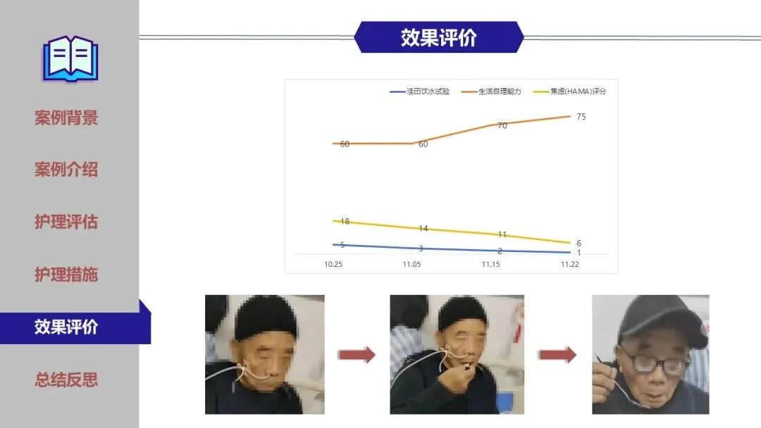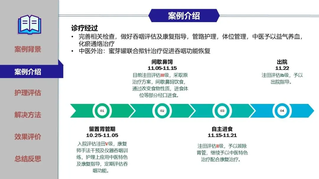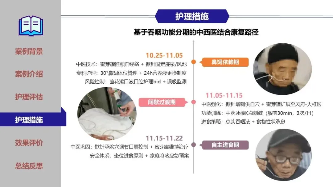 在鼻饲期、经口进食过渡期及家庭康复期,团队实施了精细化护理,包括蜜芽罐推颈前经络、揿针刺激廉泉、风池等穴位、中药冰棒K点刺激、点头吞咽训练及食物性状改良等。同时建立了严格的误吸监测与家庭呛咳应急预案,确保患者安全。经综合干预,患者吞咽功能显著改善,成功恢复经口进食,缩短了吞咽反射重建周期。为患者成功拔除了胃管,恢复自主进食,有效缩短了康复进程,达到医院和患者的共赢,提高了患者的满意度。