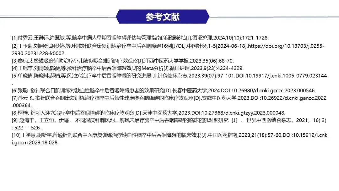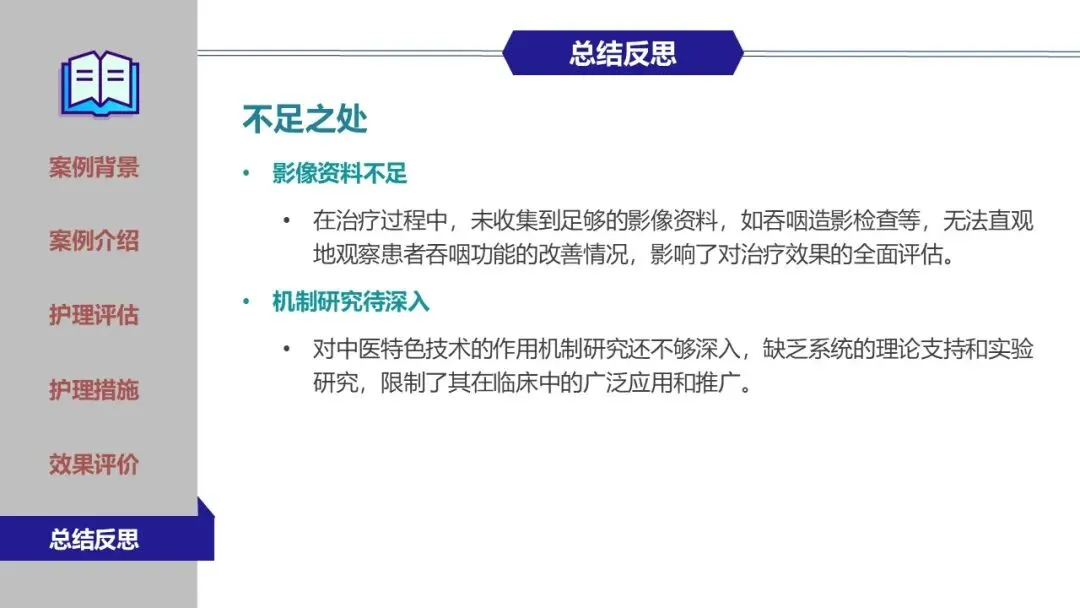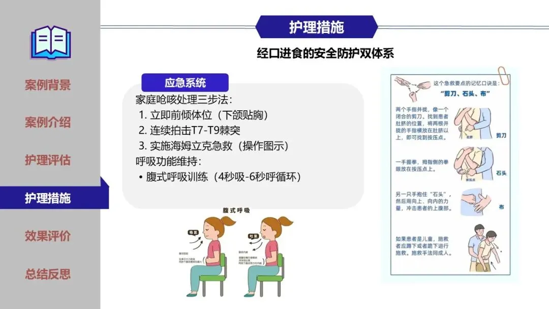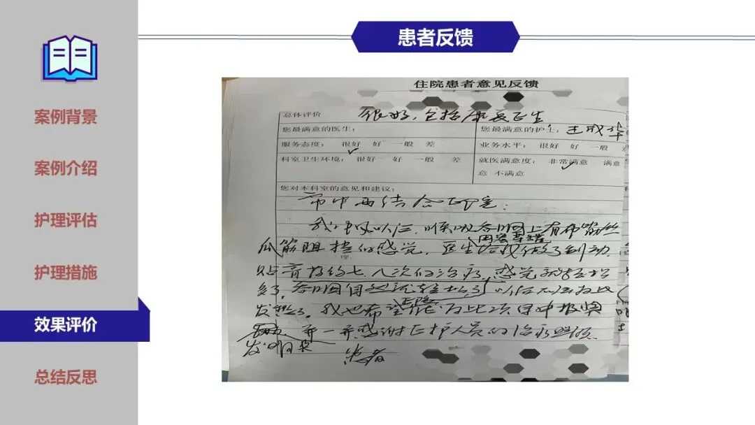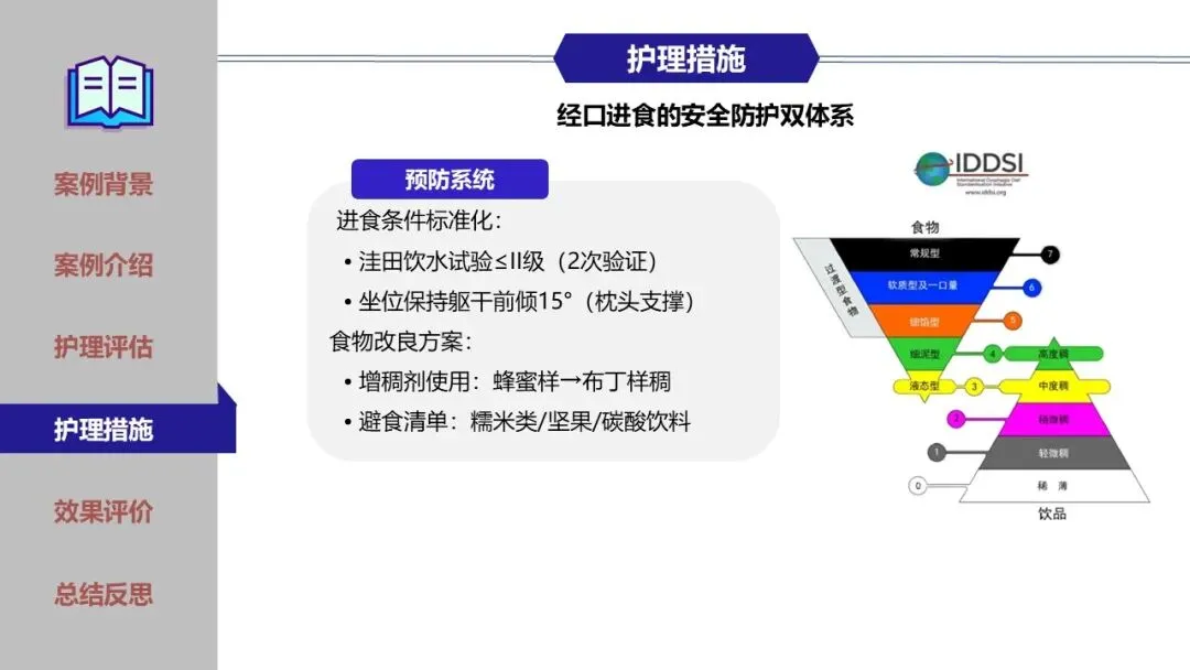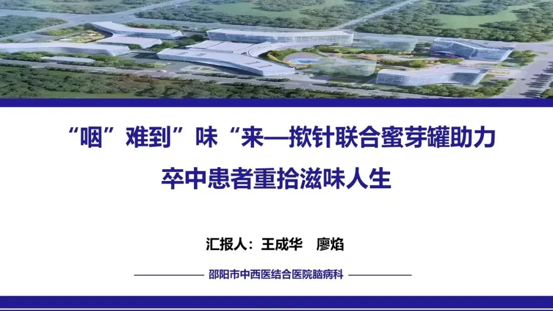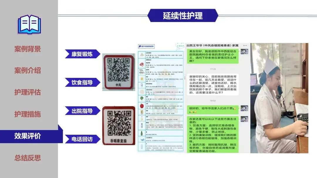 在鼻饲期、经口进食过渡期及家庭康复期,团队实施了精细化护理,包括蜜芽罐推颈前经络、揿针刺激廉泉、风池等穴位、中药冰棒K点刺激、点头吞咽训练及食物性状改良等。同时建立了严格的误吸监测与家庭呛咳应急预案,确保患者安全。经综合干预,患者吞咽功能显著改善,成功恢复经口进食,缩短了吞咽反射重建周期。为患者成功拔除了胃管,恢复自主进食,有效缩短了康复进程,达到医院和患者的共赢,提高了患者的满意度。
