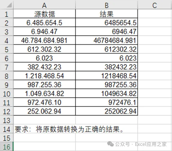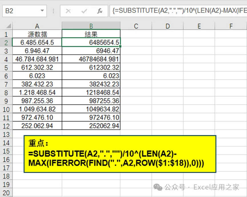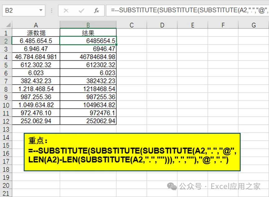 这条公式的思路是最基本、常规的解题思路。既然要将文本型数据转换为数值,那就要保留最后一个“.”,然后将其它的“.”全部替换掉。