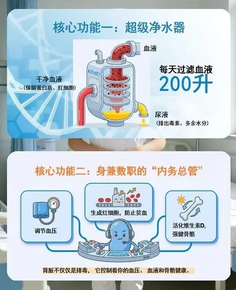 慢性肾衰竭就像潜伏在身边的 “隐形敌人”,我国患病率约 10.8%,每 10 个人里就有 1 个中招,但它早期几乎没症状 —— 肾脏哪怕损坏 50%,仍能勉强维持身体运转,等出现不适时往往已到晚期。肾脏不仅是 “超级净水器”,每天过滤 200 升血液排出毒素,还能调节血压、生成红细胞、强健骨骼,一旦受损不可逆,会给健康带来连锁危害。