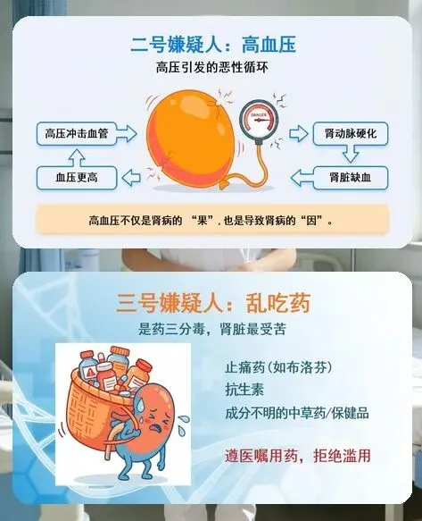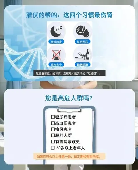要对付这个 “杀手”,先得认清它的 “帮凶”。糖尿病、高血压是头号和二号诱因,长期高血糖会损伤肾小球,高压会导致肾动脉硬化缺血;乱吃药也会伤肾,止痛药、部分抗生素和不明成分的中草药都可能加重肾脏负担;经常熬夜、长期憋尿、喝水太少、抽烟喝酒这些坏习惯,也在悄悄透支肾脏功能。尤其是糖尿病、高血压、肥胖人群,有肾病家族史或 60 岁以上的老年人,都是高危群体,更要提高警惕。