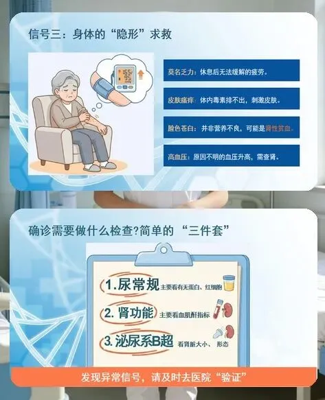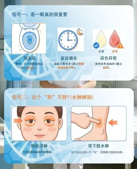 早期筛查是关键。咱们要学会识别身体的 “求救信号”:夜尿增多、尿色异常、泡沫尿,晨起眼睑或双下肢水肿,还有莫名乏力、脸色苍白、皮肤瘙痒等,都可能是肾脏的预警。定期做尿常规、肾功能检查和泌尿系 B 超这 “三件套”,就能及时发现问题,为治疗争取时间。