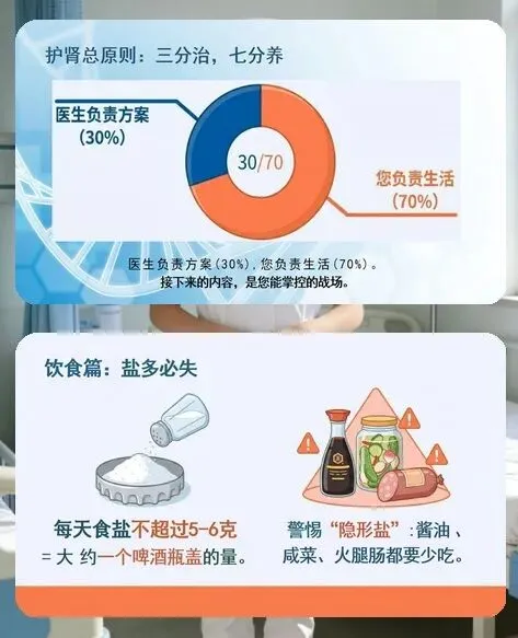 护肾更要靠日常养护。饮食上每天食盐不超过 5-6 克,少吃隐形盐,优选鱼、鸡、蛋、奶等优质蛋白;饮水要适量,正常人每天 1500-2000 毫升,水肿或少尿患者需严格控水;坚持快走、太极拳等适度运动,控制体重;用药必须遵医嘱,拒绝偏方和保健品;保持良好心态,避免焦虑,这场慢性病 “持久战” 需要耐心和坚持。