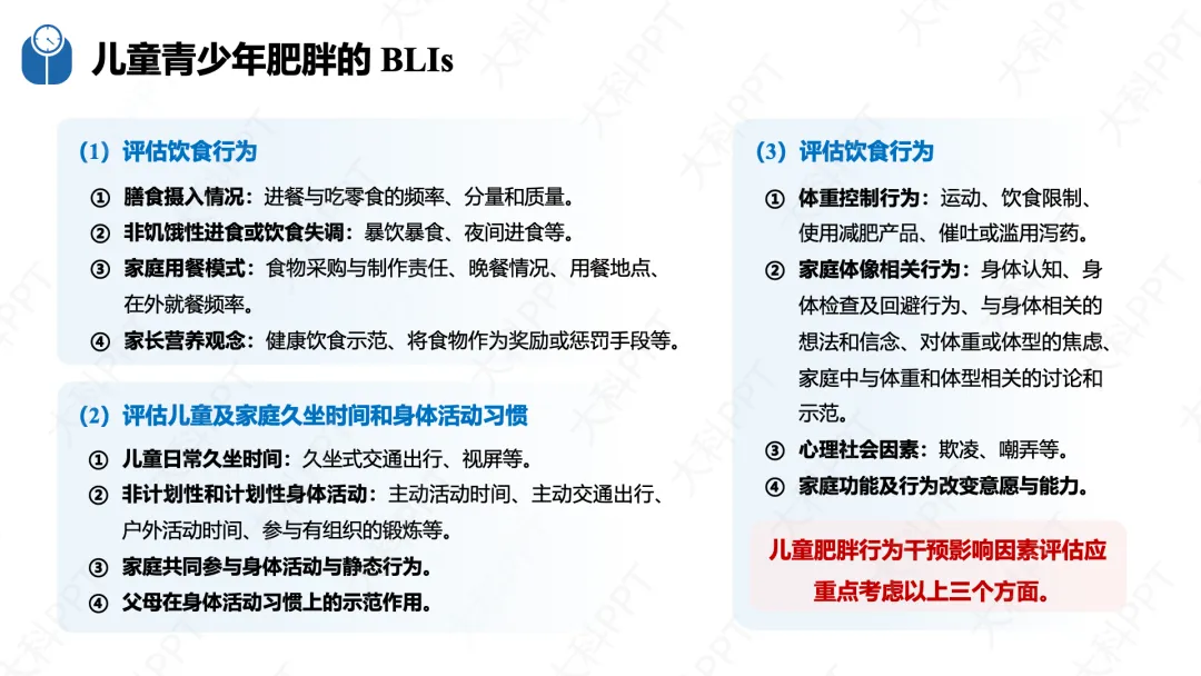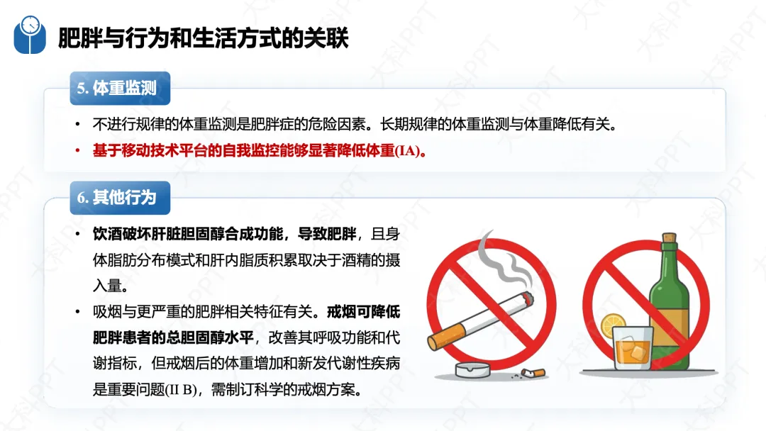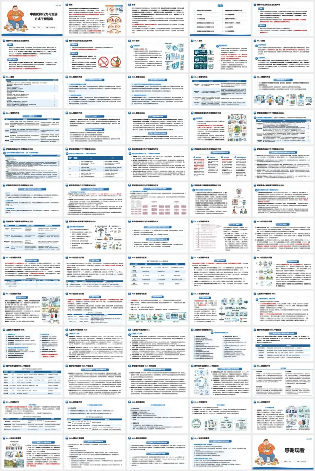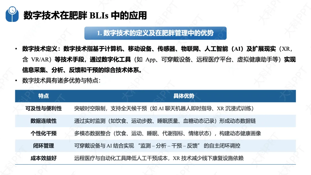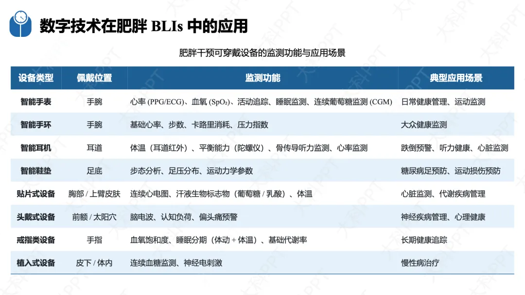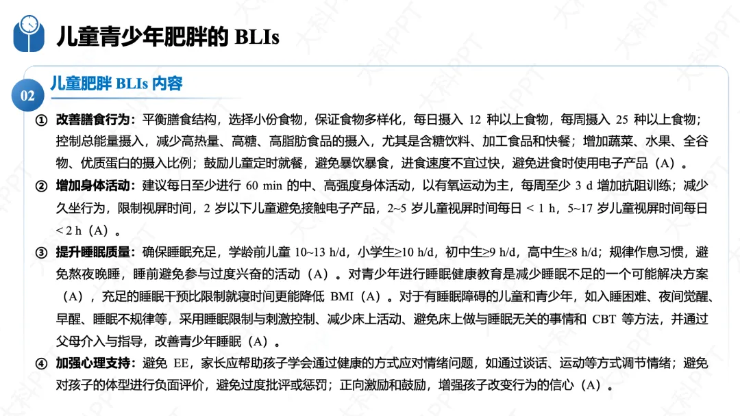 数字技术是 BLIs 的重要赋能手段,核心围绕精准化诊断、个性化干预、全周期监测三大目标,涵盖移动 App、可穿戴设备、AI、VR 等技术形式,具有可及性高、数据连续、个性化强等优势,可应用于膳食管理、运动干预、睡眠与压力管理等场景,实现 “监测 - 分析 - 干预 - 反馈” 的闭环管理。同时指南明确了 BLIs 的效果评价体系,遵循全程性、科学性等原则,采用随机对照试验等设计,从生理、行为、心理多维度设置评价指标,开展形成性、过程性和实施性评价。此外,干预保障还包括提高 BLIs 实际效果、重视体重反弹预防和文化适应性,必要时合理结合药物和手术治疗,明确成年及儿童青少年患者的转诊指征,确保肥胖干预的科学性、持续性和规范性。(仅展示部分ppt)