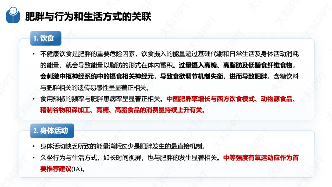 肥胖的发生与行为和生活方式密切相关,核心关联因素集中在饮食、身体活动、睡眠、精神心理及其他行为等维度。饮食方面,不健康饮食是关键危险因素,能量摄入超过消耗会导致脂肪蓄积,高糖、高脂、低膳食纤维食物及含糖饮料的过量摄入,会失衡食欲调节机制,而食用辣椒频率、西方饮食模式等也与肥胖患病率正相关。身体活动缺乏是肥胖发生的直接机制,久坐行为如长时间视屏,会减少能量消耗,增加肥胖风险,中等强度有氧运动是首要推荐的改善方式。睡眠紊乱通过影响糖脂代谢、脂肪因子分泌等,导致食欲增加和能量消耗减少,加剧肥胖风险。慢性压力激活相关生理轴,引发情绪性进食,精神心理障碍与肥胖相互影响,而规律体重监测则有助于体重管理,不规律监测会增加肥胖风险。