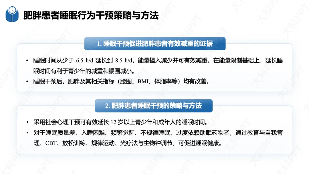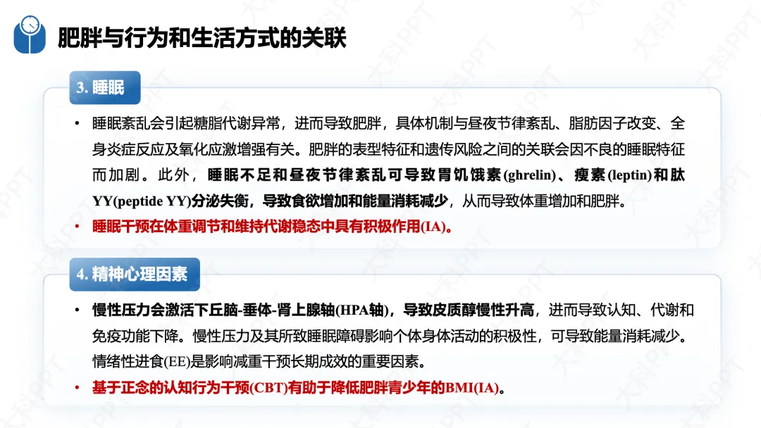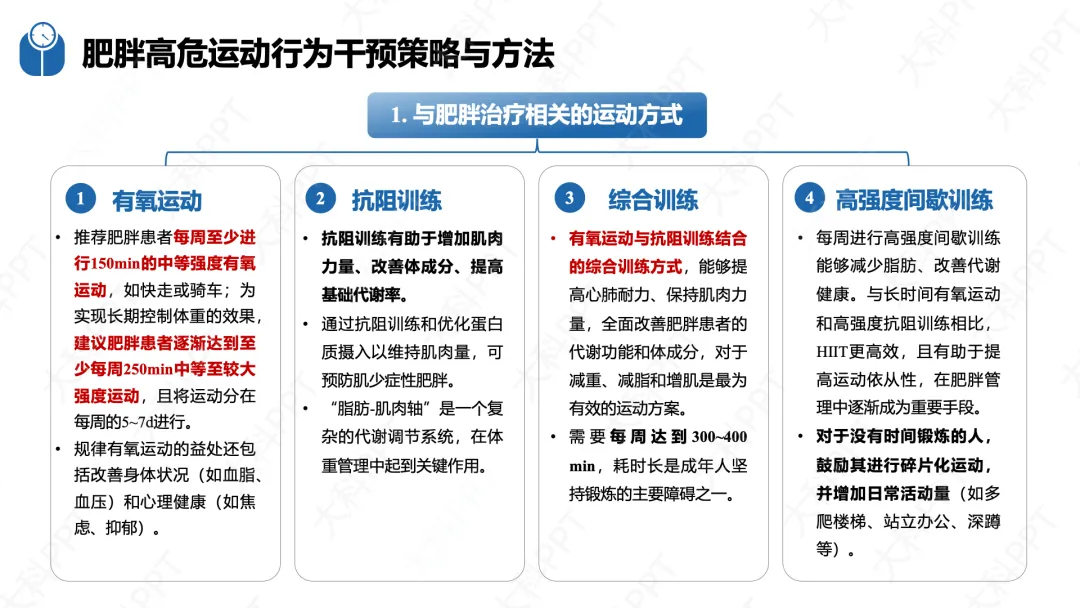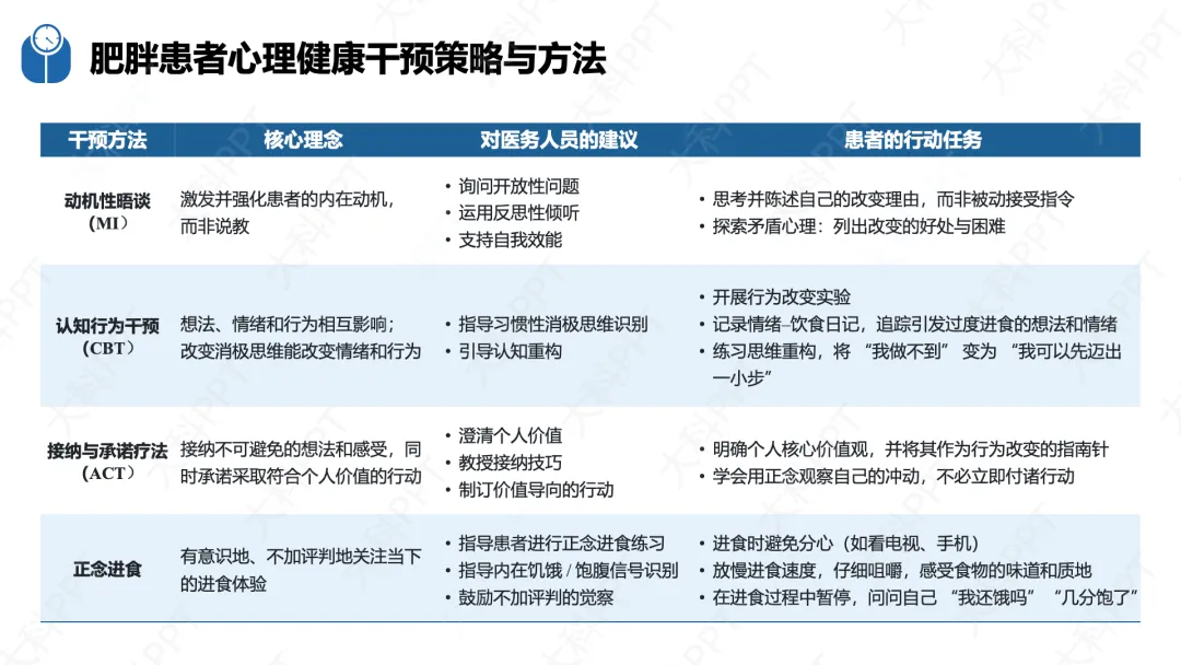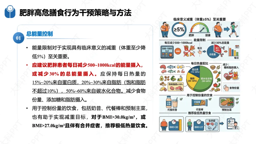 指南从膳食、运动、心理、睡眠四大核心维度制定了针对性干预策略。膳食干预以控制总能量摄入为核心,推荐地中海膳食、植物性饮食等健康模式,科学管理进食习惯、方式、地点和情绪,从自我觉察、替代强化等层面改善膳食行为。运动干预强调 “动则有益”,推荐有氧运动、抗阻训练等多种方式,开具个体化运动处方,结合心理行为支持提升运动依从性,同时兼顾特殊人群的运动安全性。心理干预整合 BCTs 与认知重构,通过动机性晤谈、正念进食等方式改善情绪性进食,筛查并干预合并的精神心理障碍。睡眠干预通过教育与自我管理、CBT、光疗法等手段改善睡眠质量,通过调节昼夜节律减少肥胖相关代谢异常,四大维度协同形成综合干预体系。(仅展示部分ppt)