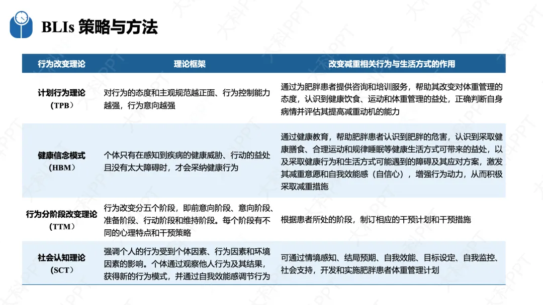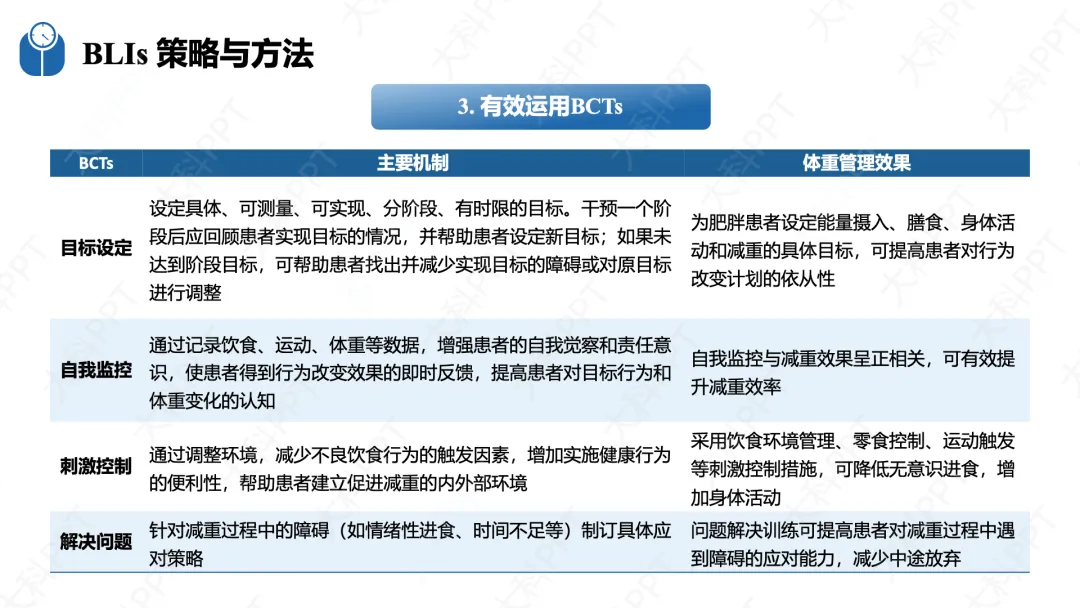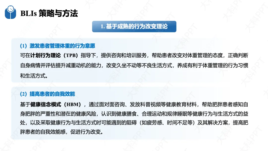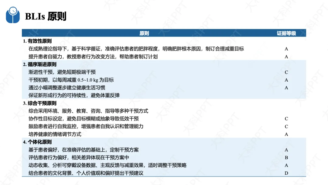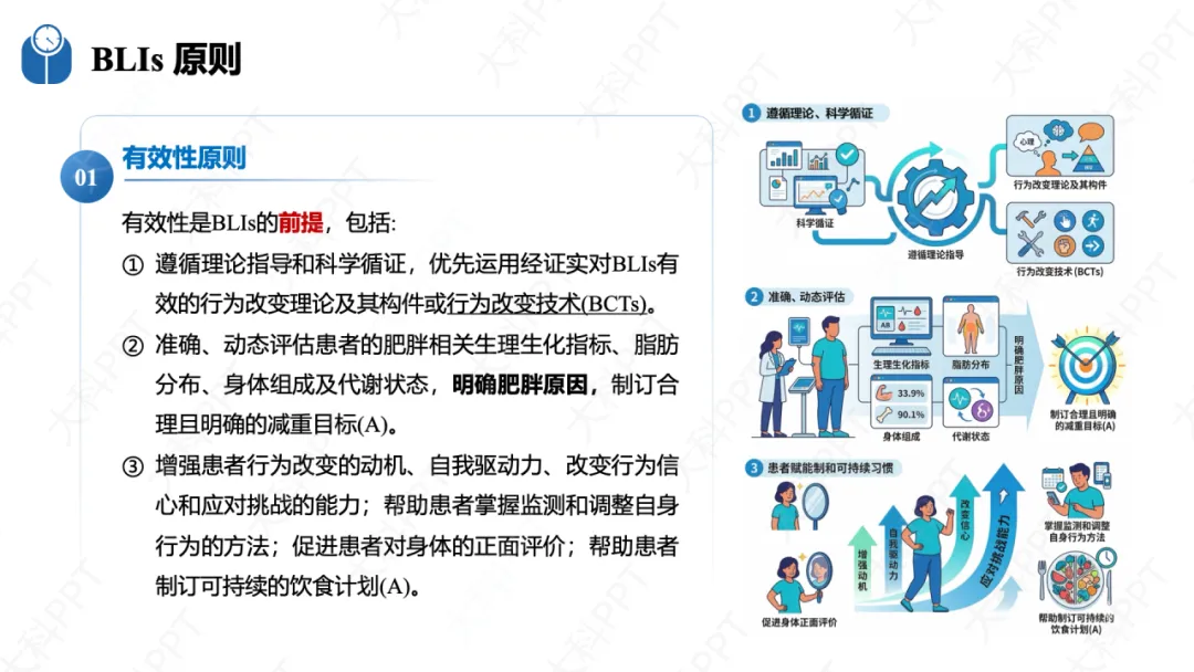 BLIs 需严格遵循有效性、循序渐进、综合干预、个体化四大原则,同时落实多学科协作(MDT)诊疗模式。有效性要求循证制订目标并提升患者自驱力;循序渐进以每周减重 0.5-1.0kg 为初期目标,避免激进干预;综合干预整合环境、教育、咨询等多种方式;个体化则结合患者行为特征、文化背景及可穿戴设备数据定制方案。基础实施策略包括运用计划行为理论、健康信念模式等成熟行为改变理论,采用回授法健康教育(TBHE),灵活使用目标设定、自我监控等行为改变技术(BCTs)和认知行为疗法(CBT),同时结合个体、团体和社会干预,借助数字技术强化干预效果,提前做好体重反弹的预防措施。(仅展示部分ppt)