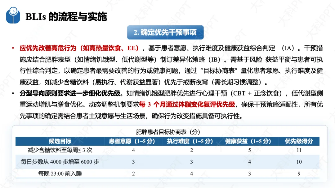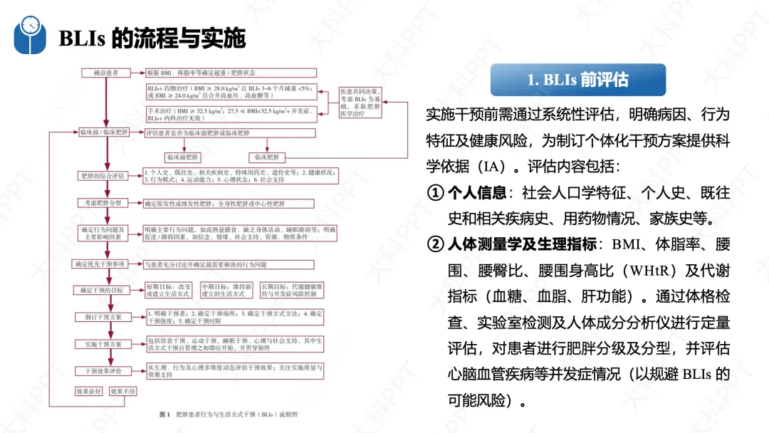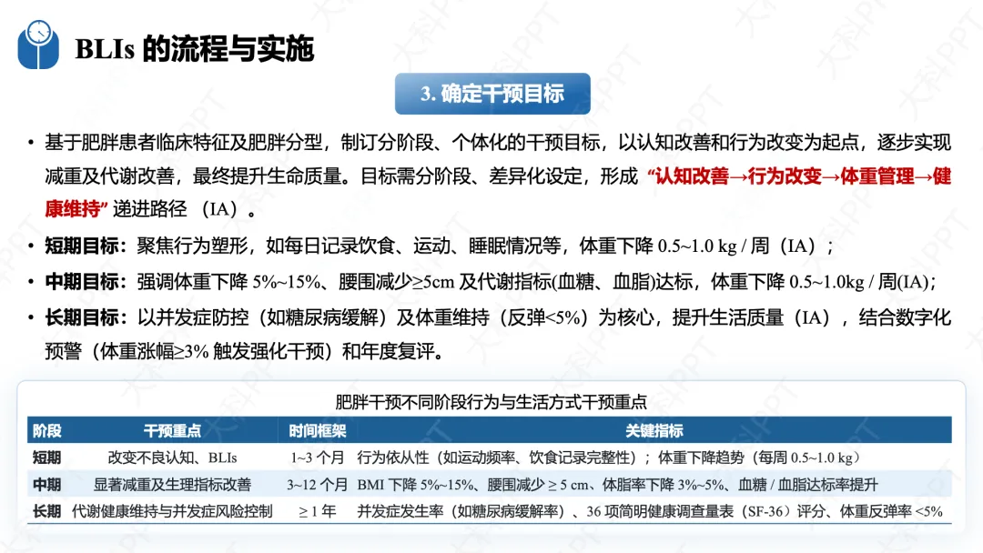 BLIs 实施遵循标准化流程,核心为 “评估 - 规划 - 实施 - 评价” 闭环管理。干预前需开展系统性评估,涵盖人体测量学指标、减重行为阶段、行为模式、心理社会因素等,明确肥胖分型与高危行为。随后结合患者意愿确定优先干预事项,按短期、中期、长期制订分阶段目标,短期聚焦行为塑形,中期实现显著减重,长期以并发症防控和体重维持为核心。干预内容以膳食和运动为核心,搭配心理、睡眠干预与社会支持;干预场所覆盖医疗机构、社区、家庭和数字化平台;方式可选择面对面、远程线上、小组活动等,强度随干预阶段动态调整,时限建议不少于 1 年。同时从生理、行为、心理多维度动态评估干预效果,根据结果及时优化干预方案。(仅展示部分ppt)