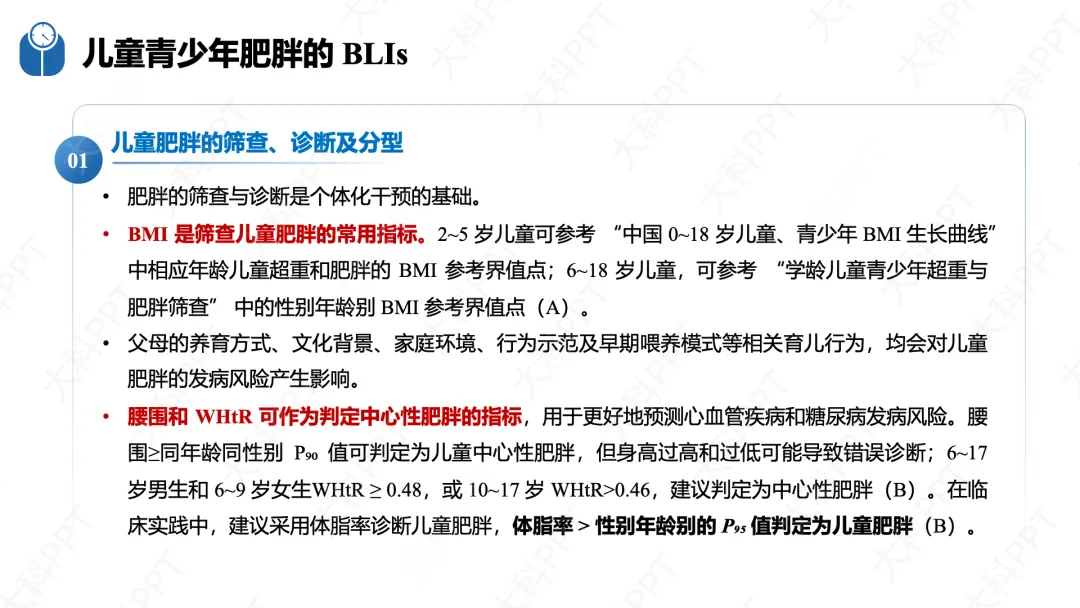 儿童青少年肥胖易持续至成年,还会引发心理行为问题、影响认知功能,其诱因主要包括高热量饮食、身体活动缺乏、睡眠不足和心理问题等。筛查诊断以 BMI 为核心指标,结合腰围、体脂率判定肥胖类型,同时评估饮食行为、身体活动习惯和心理社会因素。干预内容与成人衔接,包括平衡膳食、每日 60 分钟中高强度身体活动、保证充足睡眠和加强心理支持,严格限制视屏时间。核心干预策略采用家庭、学校、社区、临床联动的多部门协作模式和全发育周期管理,家庭需做好饮食示范和运动陪伴,学校强化营养教育和体育课程,社区完善运动设施并开展科普活动,临床提供不少于 26 小时的面对面家庭式咨询,多方协同营造健康成长环境。(仅展示部分ppt)