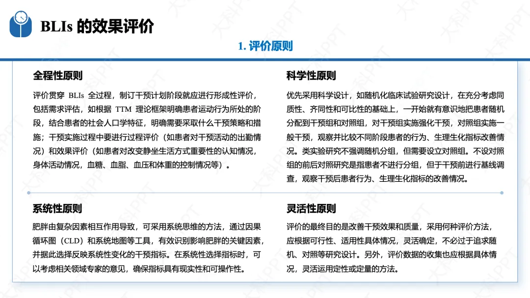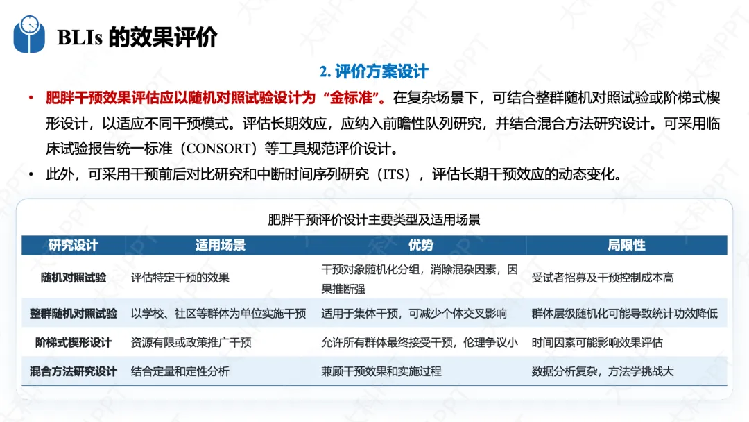 BLIs 效果评价旨在通过多维度评估减重相关行为、体重及健康状况改善情况,为优化干预措施提供科学依据,需遵循全程性、科学性、系统性、灵活性四大原则。评价贯穿干预全流程,制订计划阶段开展形成性评价,实施中进行过程评价和效果评价;以随机对照试验为设计金标准,复杂场景可结合整群随机、阶梯式楔形设计,长期效应评估纳入前瞻性队列研究。评价指标分有效性、过程性、实施性三类,有效性涵盖生理、行为、心理维度,过程性关注干预执行与患者依从性,实施性参考 RE-AIM 框架评估可行性与可持续性。数据收集采用定性与定量结合方式,可穿戴设备提供动态连续数据,评价结果用于动态调整干预方案,确保干预效果落地。(仅展示部分ppt)