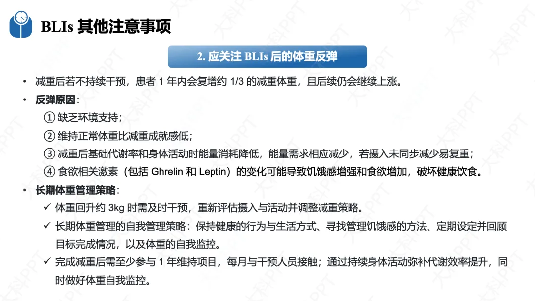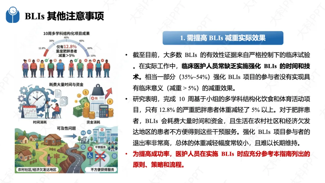 实施 BLIs 需重视五大关键注意事项,首先要提升实际减重效果,因临床中强化 BLIs 的参与者常难实现 5% 以上的临床意义减重,且农村和欠发达地区可及性低、退出率高,医护人员需严格遵循指南原则策略开展干预。其次需重点预防体重反弹,减重后若不持续干预,患者易在一年内复重,需在体重小幅回升时及时干预,坚持高身体活动水平、规律体重监测,参与至少一年的减重维持项目。再者要关注文化适应性,结合患者文化背景、个人需求制定方案,避免体重歧视。同时不可偏废药物和手术治疗,明确不同 BMI 人群的用药和手术指征,由多学科团队实施并随访。最后需把握转诊时机,针对成年和儿童青少年患者的不同情况,及时转诊至专科门诊或手术中心。(仅展示部分ppt)