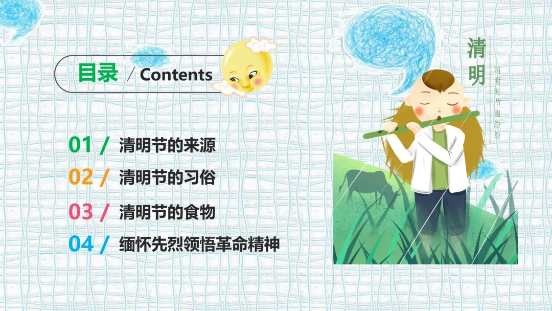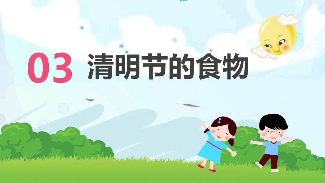 1.认知目标:了解清明节的由来(介子推传说、寒食节演变)、主要习俗(扫墓、踏青、放风筝等)及特色美食。