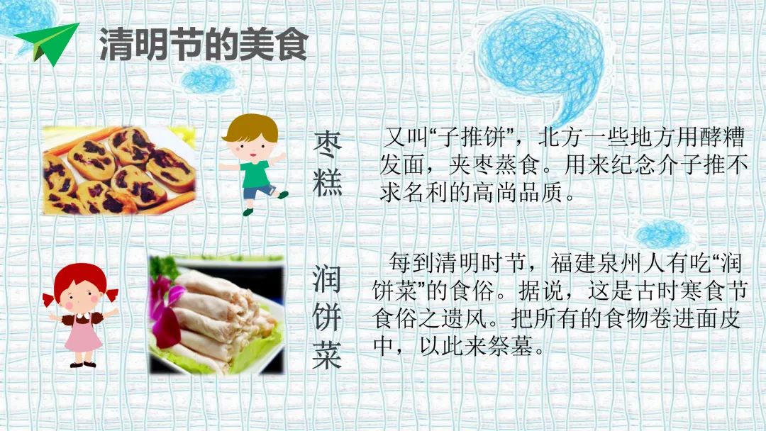 o历史传说:相传大禹治水后,人们用“清明”庆贺天下太平;以及寒食节与介子推的传说(为后续讲枣糕做铺垫)。