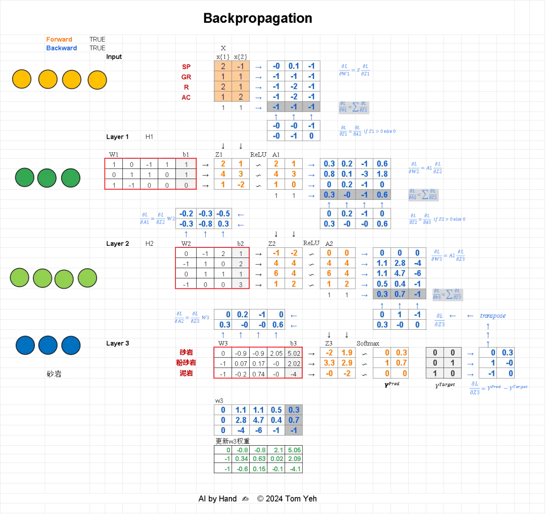 它不是什么高深的技术,就是让机器拥有「复盘调整」的能力——就像你陪孩子中考备考,先凭着经验安排时间(机器凭现有参数预测),再通过摸底成绩看差距(算误差),倒着找每个变量的问题(分配误差),然后针对性调整(更新参数),反复迭代,直到达到目标。没有反向传播,神经网络就是一个只会瞎猜的“笨蛋”(就像你瞎调整时间,越调越差);有了反向传播,它才能像你陪孩子备考一样,不断复盘、不断调整,慢慢学会精准预测、高效完成任务——不管是识别图片、听懂语音,还是写出文案,本质都是这样“反复调整、越做越好”的过程。下次再听到「反向传播」,就想想“陪孩子中考备考”的场景——从成绩倒推问题,精准调整变量,反复迭代提升,就是这么简单~那么回到Excel大模型系类,如何修正参数,就是靠右边几个蓝色矩阵,不过很可惜,Tom老师没接着。需要你自己动手添加两个表格。看下边截图,对照文字应该能看懂。
