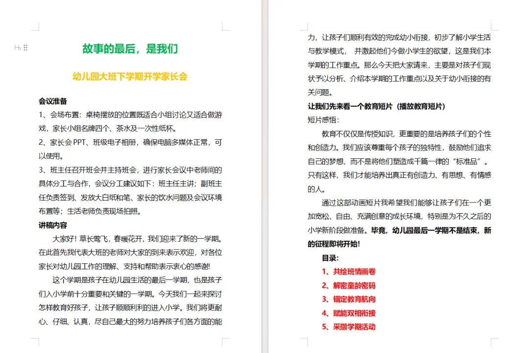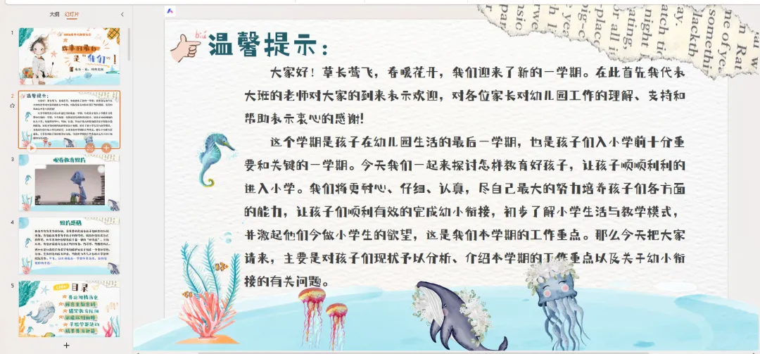 大家好!草长莺飞,春暖花开,我们迎来了新的一学期。在此首先我代表大班的老师对大家的到来表示欢迎,对各位家长对幼儿园工作的理解、支持和帮助表示衷心的感谢!