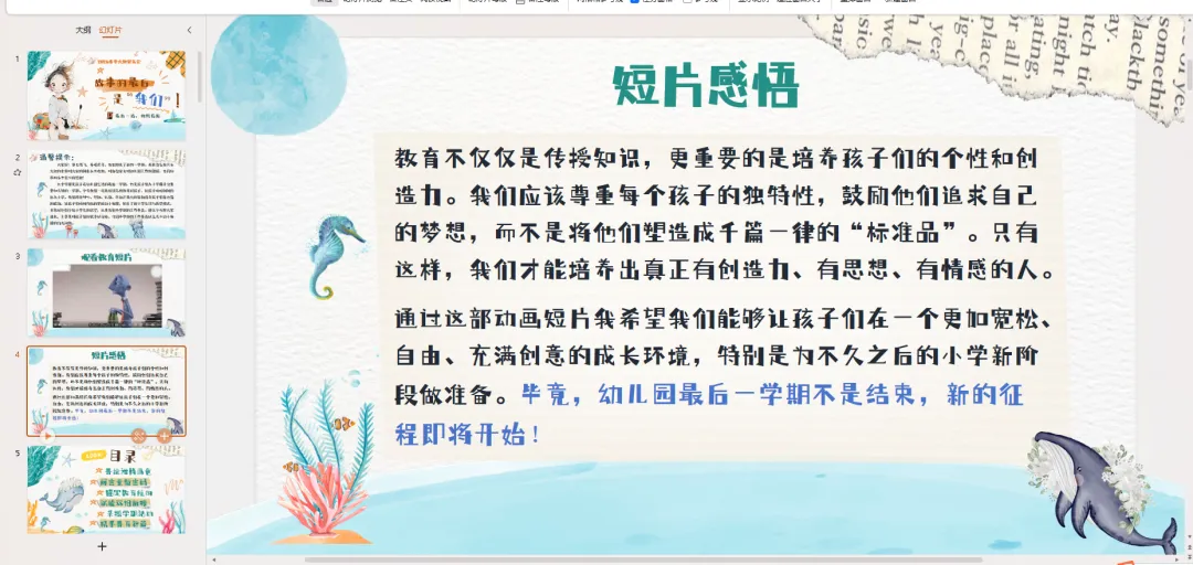 通过这部动画短片我希望我们能够让孩子们在一个更加宽松、自由、充满创意的成长环境,特别是为不久之后的小学新阶段做准备。毕竟,幼儿园最后一学期不是结束,新的征程即将开始!