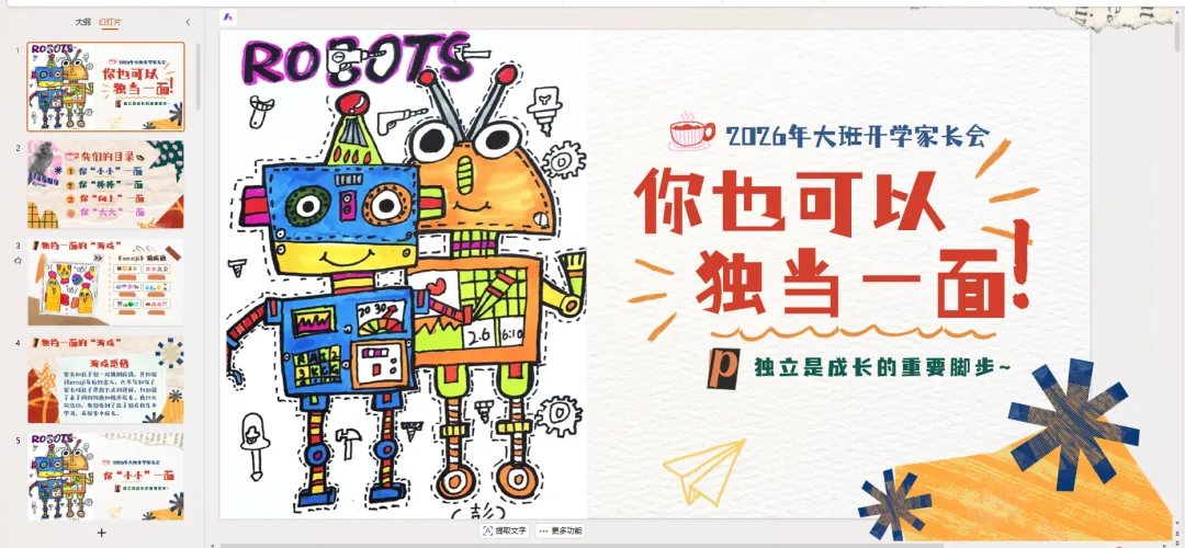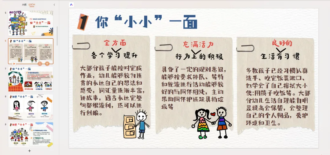 大班幼儿相比中班时已有显著进步,但仍需继续加强独立性的培养,确保他们能够顺利地参与到幼儿园的各项活动中。