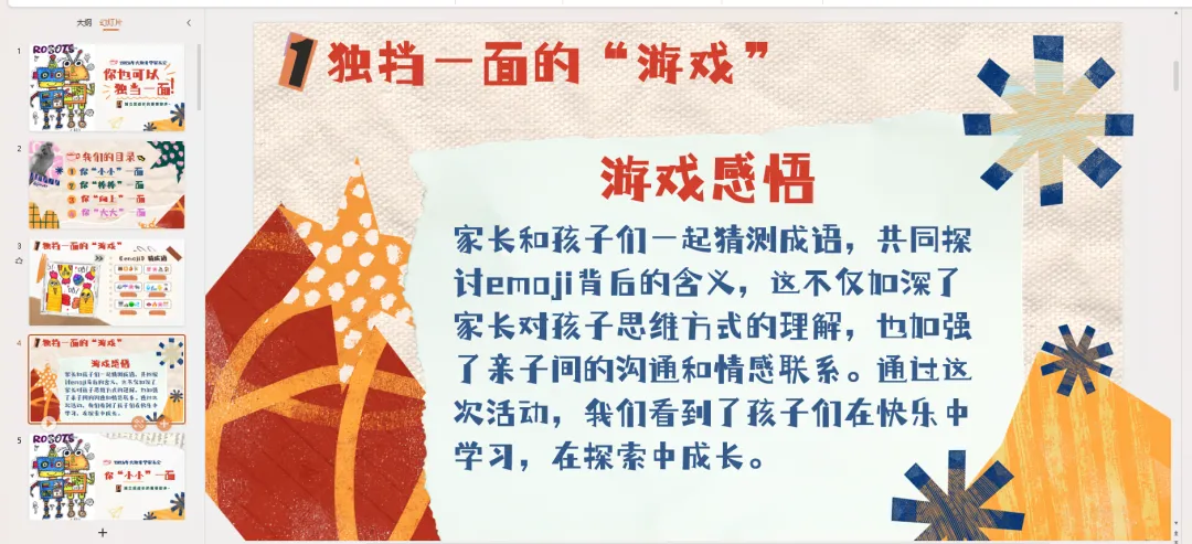 家长和孩子们一起猜测成语,共同探讨emoji背后的含义,这不仅加深了家长对孩子思维方式的理解,也加强了亲子间的沟通和情感联系。通过这次活动,我们看到了孩子们在快乐中学习,在探索中成长。作为教育者,我们深感欣慰,也更加坚信,通过寓教于乐的方式,可以更好地激发孩子们的潜能。