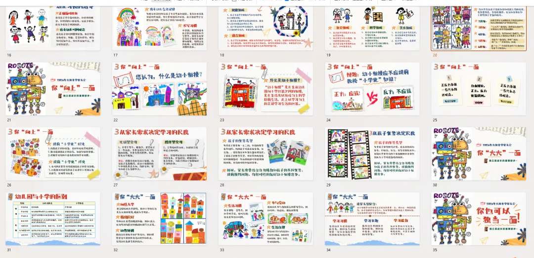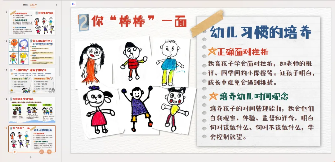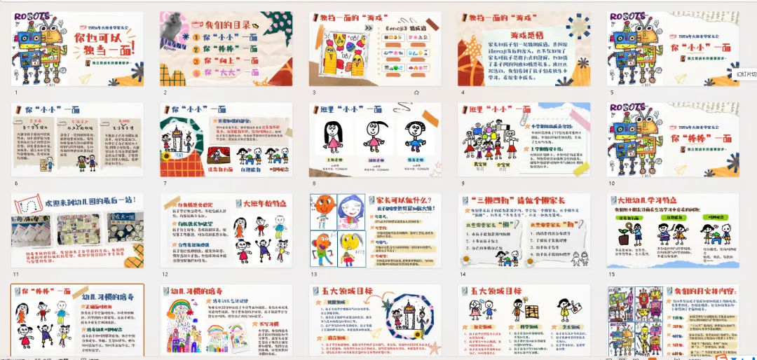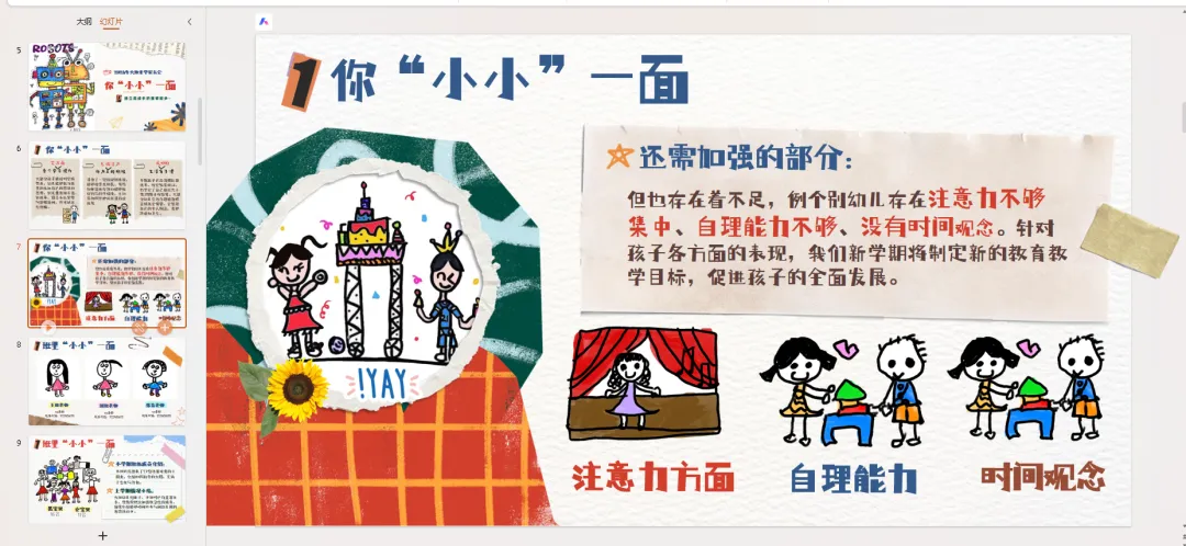 各个学习全方面提升:大部分孩子能按时完成作业,幼儿能够较为连贯的表达自己的想法和感受,词汇量逐渐丰富,讲故事,语言表达完整句都很流利,还可以进行创编。