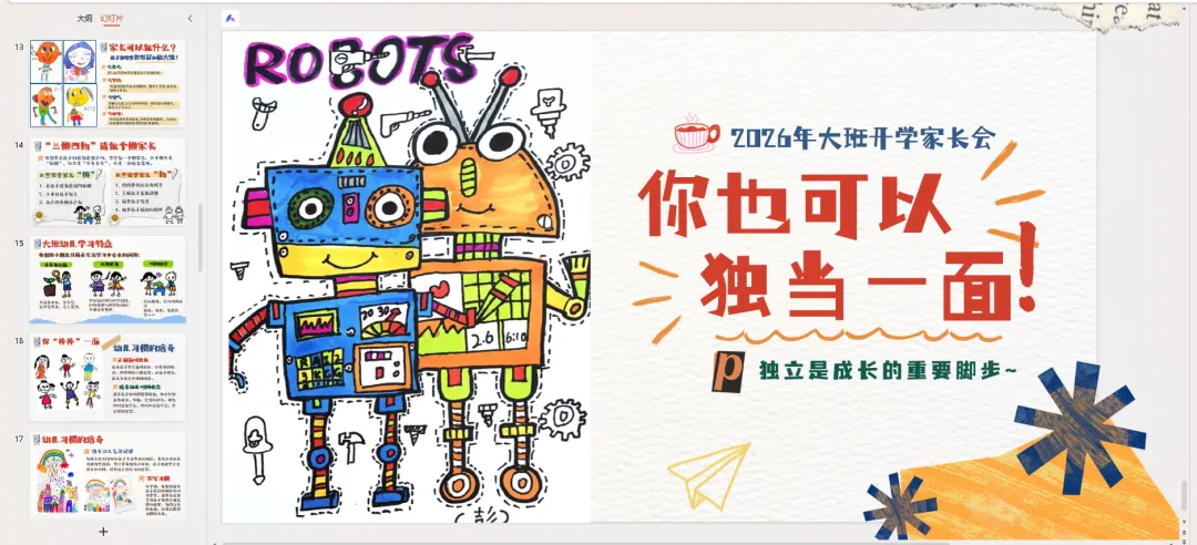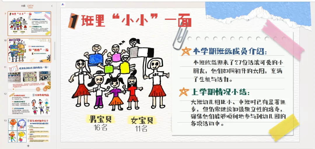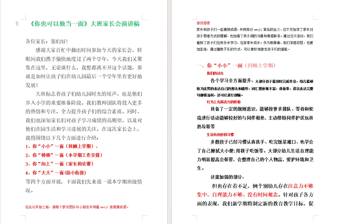 大班标志着孩子们幼儿园时光的尾声,也是他们步入小学的重要准备阶段。我们教师团队将投入更多的热情和专注,全力提升孩子们的综合素质。同时,我们也深知家长们对孩子学习成绩的高期望,以及对他们在园生活和学习进展的关注。在这次家长会上,我将围绕以下几个方面进行介绍: