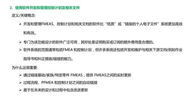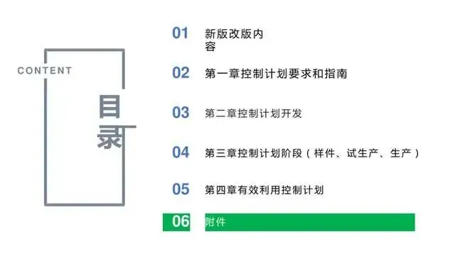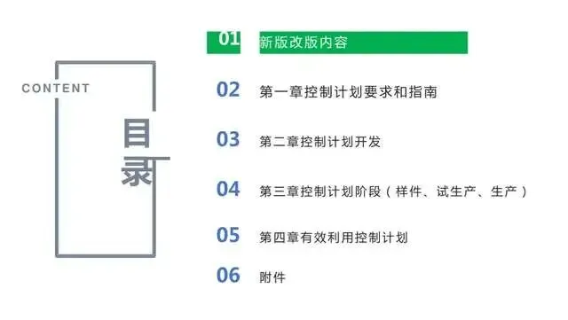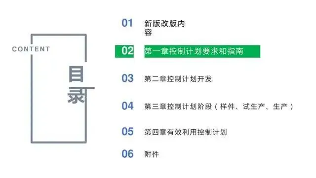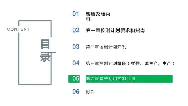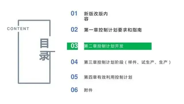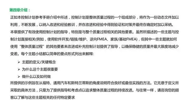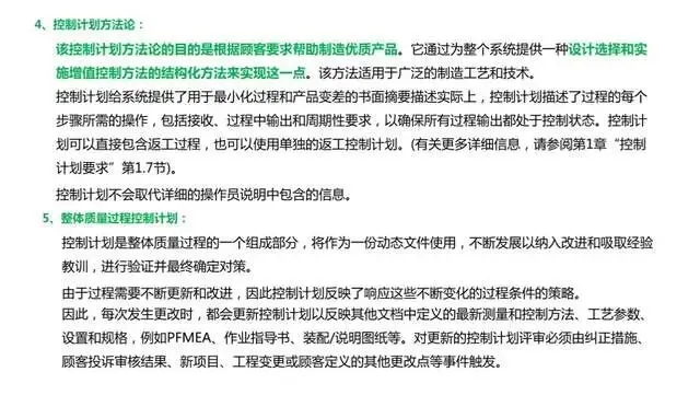 3、对编制控制计划进行详细的指导以前仅仅是对控制计划的格式和表格内容进行了介绍。鉴于控制计划在实践应用中存在各种问题,这次控制计划形成独立手册,针对控制计划的编制进行了详细的指导,着重关注控制计划的产生过程。