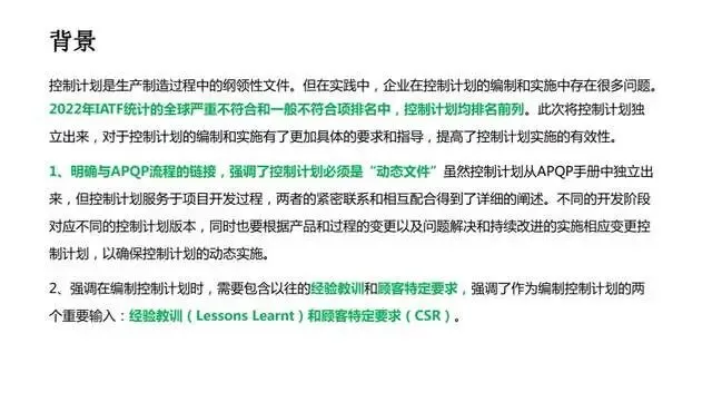 2、强调在编制控制计划时,需要包含以往的经验教训和顾客特定要求,强调了作为编制控制计划的两个重要输入:经验教训(Lessons Learnt)和顾客特定要求(CSR)。