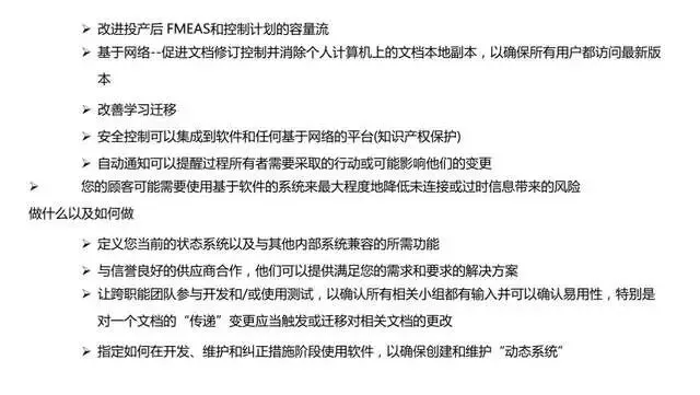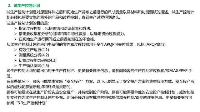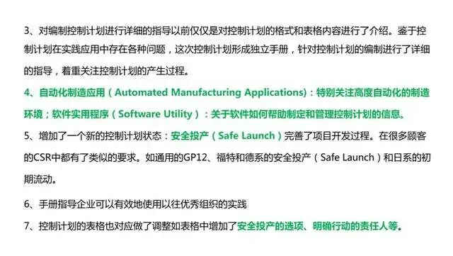 4、自动化制造应用(Automated Manufacturing Applications):特别关注高度自动化的制造环境;软件实用程序(Software Utility):关于软件如何帮助制定和管理控制计划的信息.5、增加了一个新的控制计划状态:安全投产(Safe Launch)完善了项日开发过程。在很多顾客的CSR中都有了类似的要求。如通用的GP12、福特和德系的安全投产(Safe Launch)和日系的初期流动。
