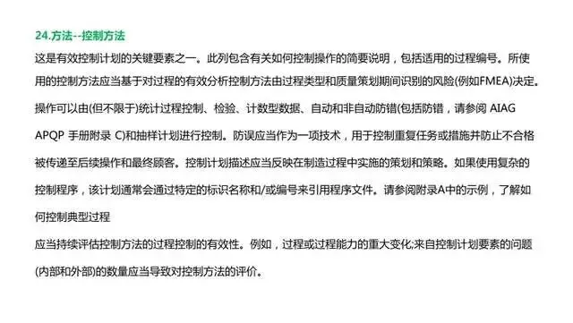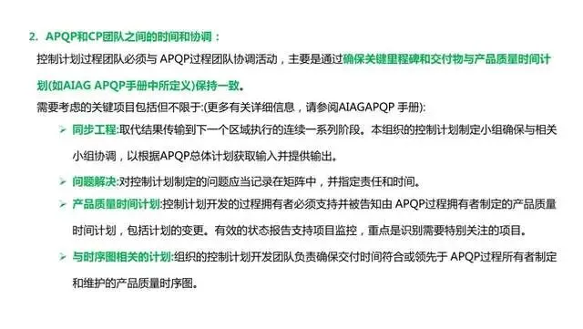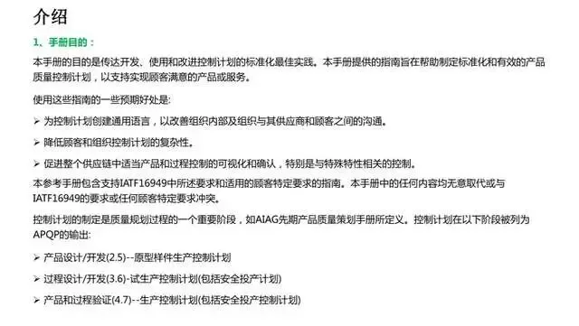 1、明确与APQP流程的链接,强调了控制计划必须是“动态文件”虽然控制计划从APQP手册中独立出来,但控制计划服务于项目开发过程,两者的紧密联系和相互配合得到了详细的阐述。不同的开发阶段对应不同的控制计划版本,同时也要根据产品和过程的变更以及问题解决和持续改进的实施相应变更控制计划,以确保控制计划的动态实施。