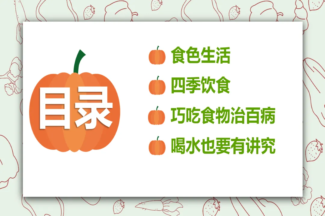🍎内容:健康生活小常识科普讲座PPT模板-医护PPT模版📅页数:共31页,无水印可二次编辑🌲目录:01 食色生活02 四季饮食03 巧吃食物治百病04 喝水也要有讲究