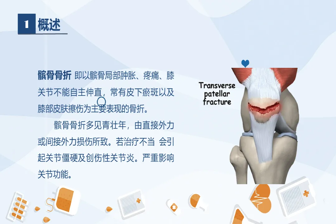 🍎内容:骨科-髌骨骨折的护理查房-医护PPT模版📅页数:共35页,无水印可二次编辑🌲目录:01 相关知识02 病史简介03 护理原则与措施04 健康指导
