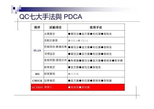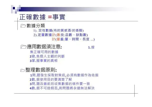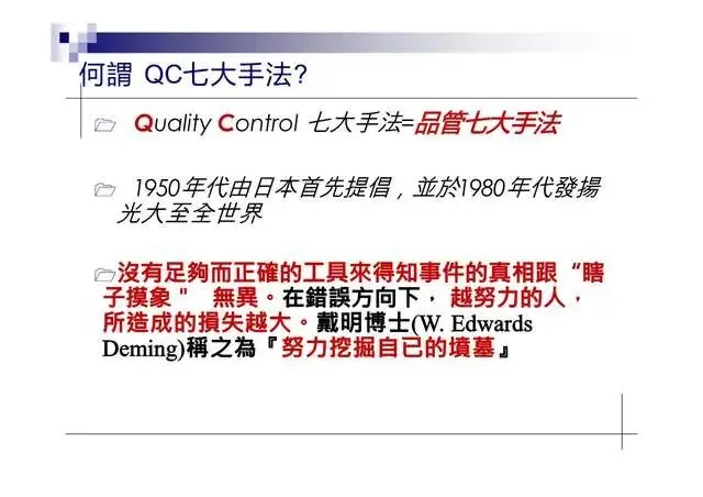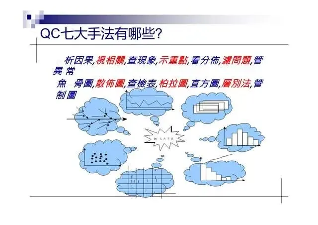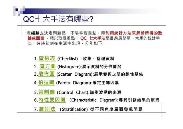 憑經驗去決定問题點·不易掌握重點·應利用統計方法來解析所得的數據或圖表·藉以取得重點;QC七大手法是目前最簡單、常用的統計手法·時時刻刻在生活中出現·分別如下: