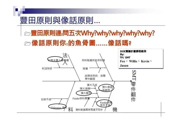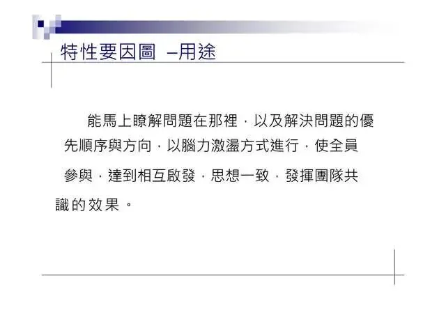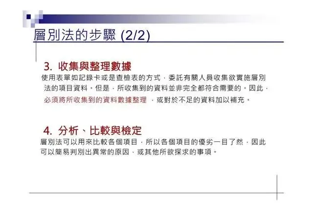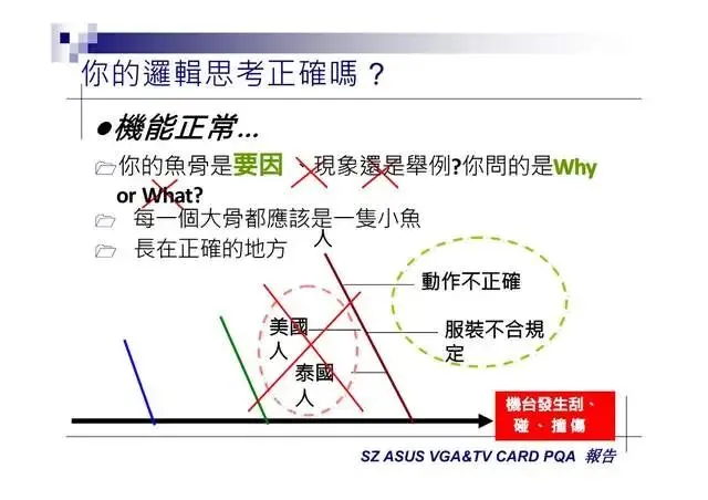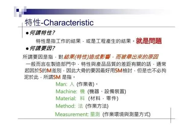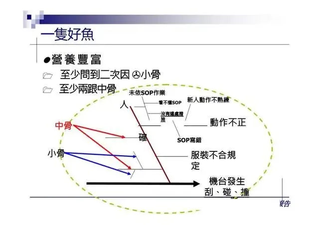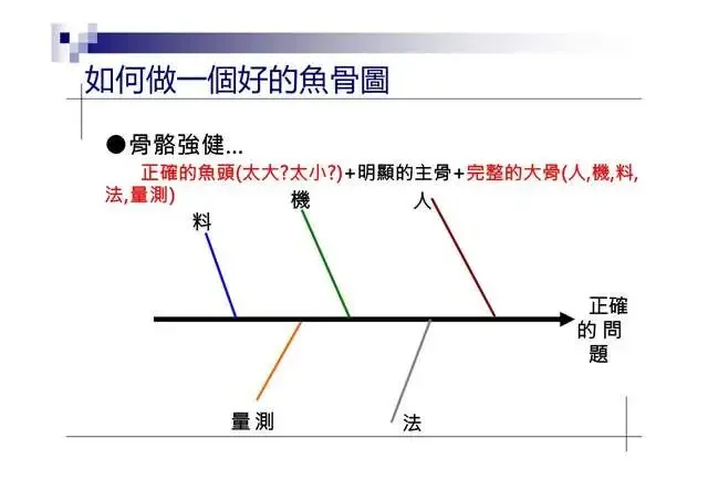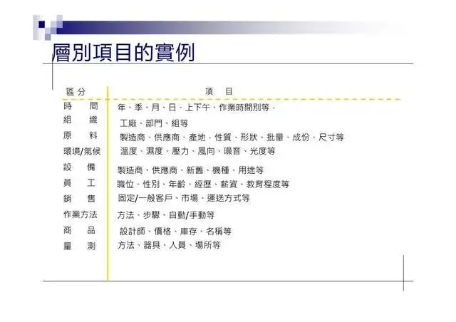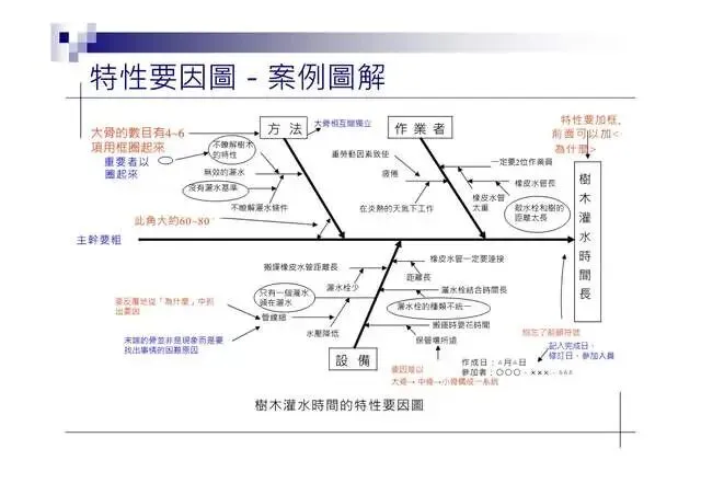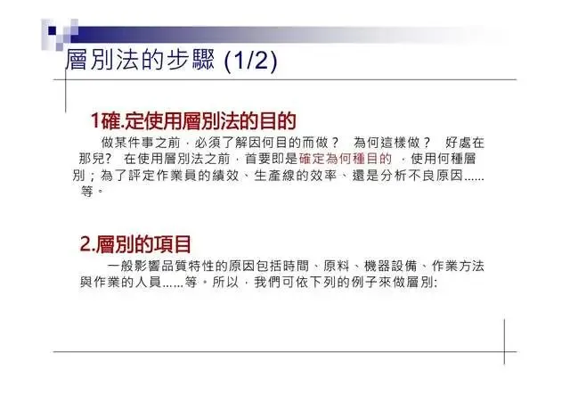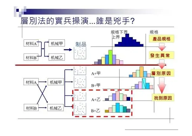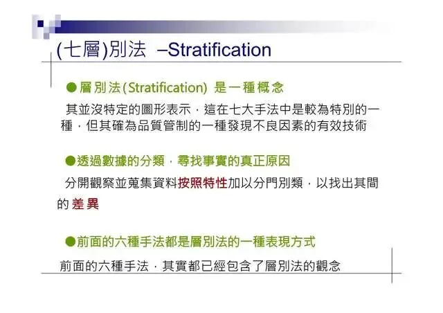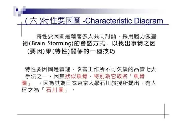 6.特性要因圖(Characteristic Diagram):尋找引發結果的原因7.層別法(Stratification):從不同角度層面發現問题