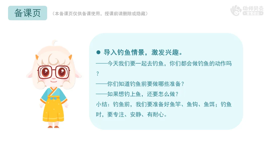 l感受“小儿垂钓”的专注,体会“垂钓”游戏的乐趣。