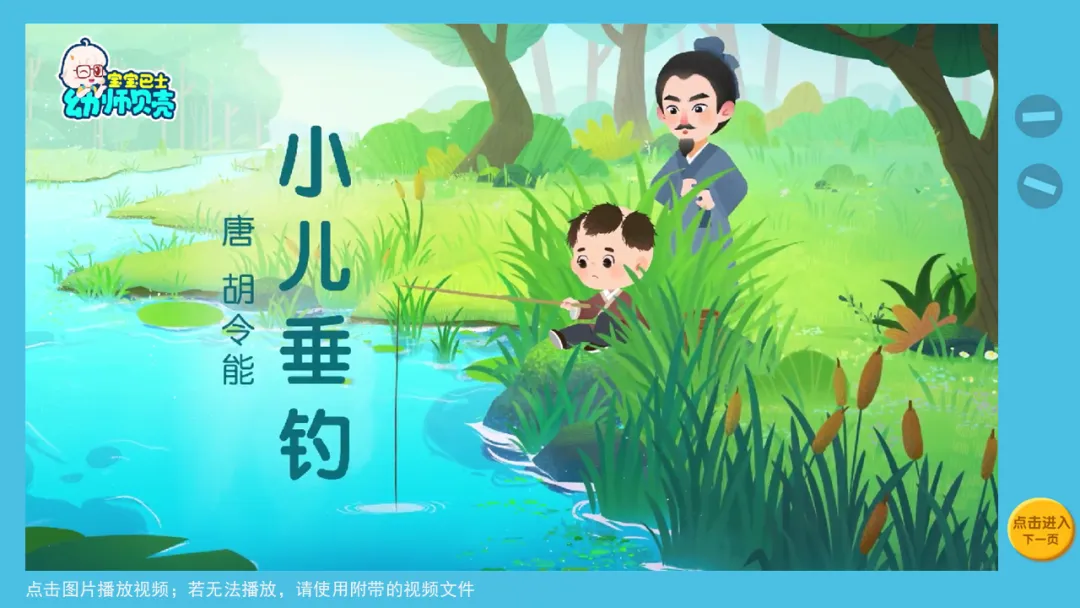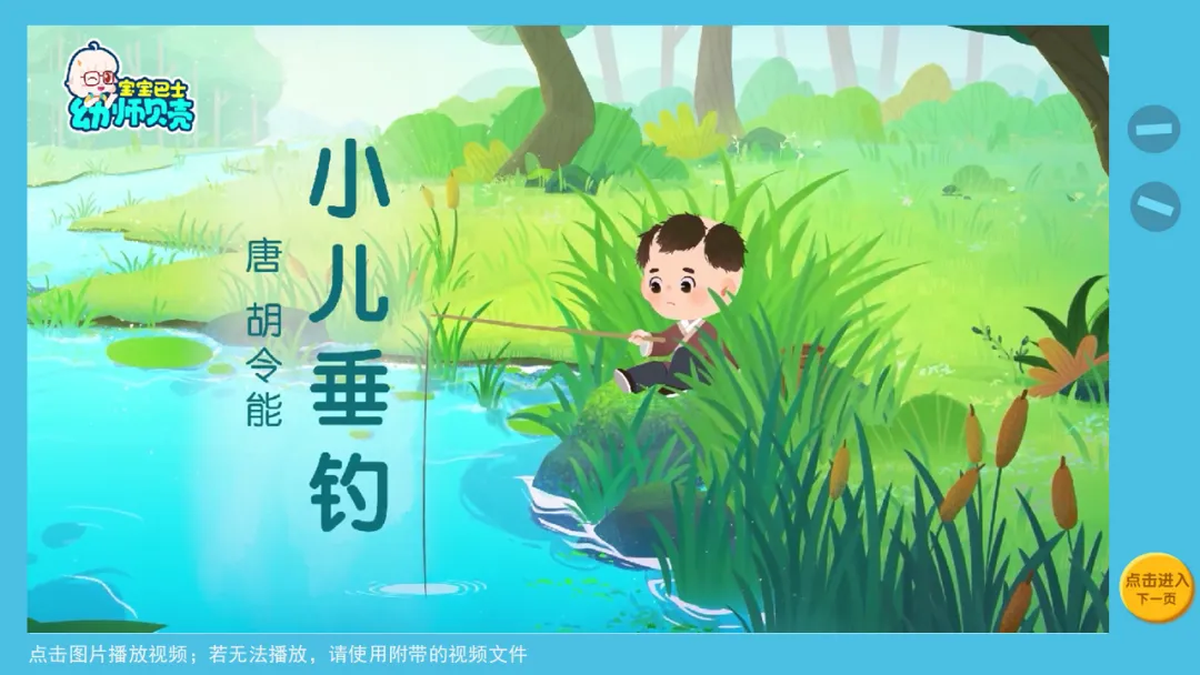 播放古诗视频《小儿垂钓》并操作课件,引导幼儿欣赏古诗,观察古诗中小朋友的表情和动作,猜测古诗内容。