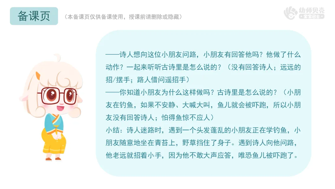 ——你知道小朋友为什么这样做吗?古诗里是怎么说的?(小朋友在钓鱼,如果不安静、大喊大叫,鱼儿就会被吓跑,所以小朋友没有回答诗人;怕得鱼惊不应人)