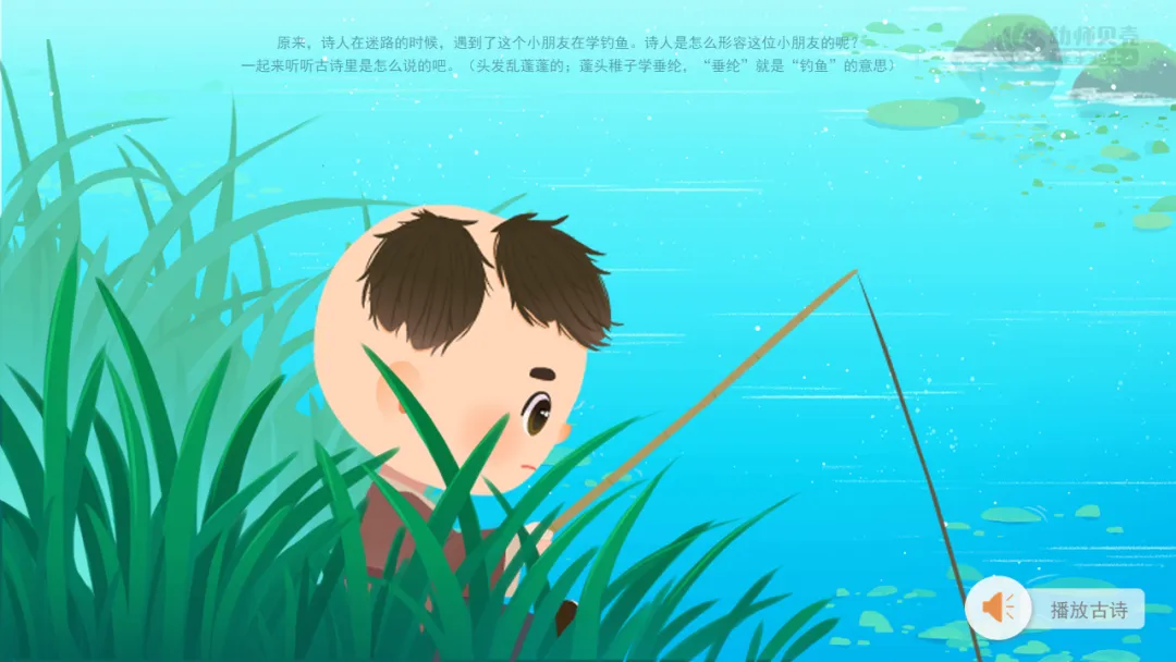 ——在唐代,有一位小朋友非常喜欢钓鱼。有一天,他钓鱼的样子正好被诗人胡令能看到了。诗人把看到这位小朋友钓鱼的事情写成了一首古诗,我们一起来听一听。
