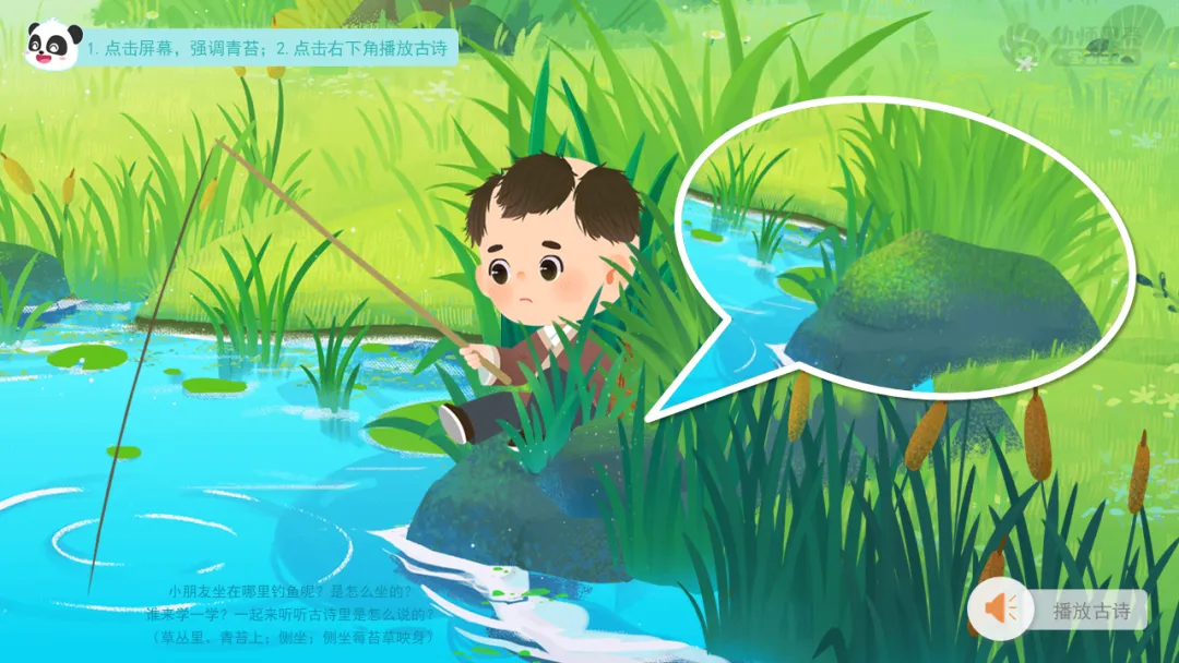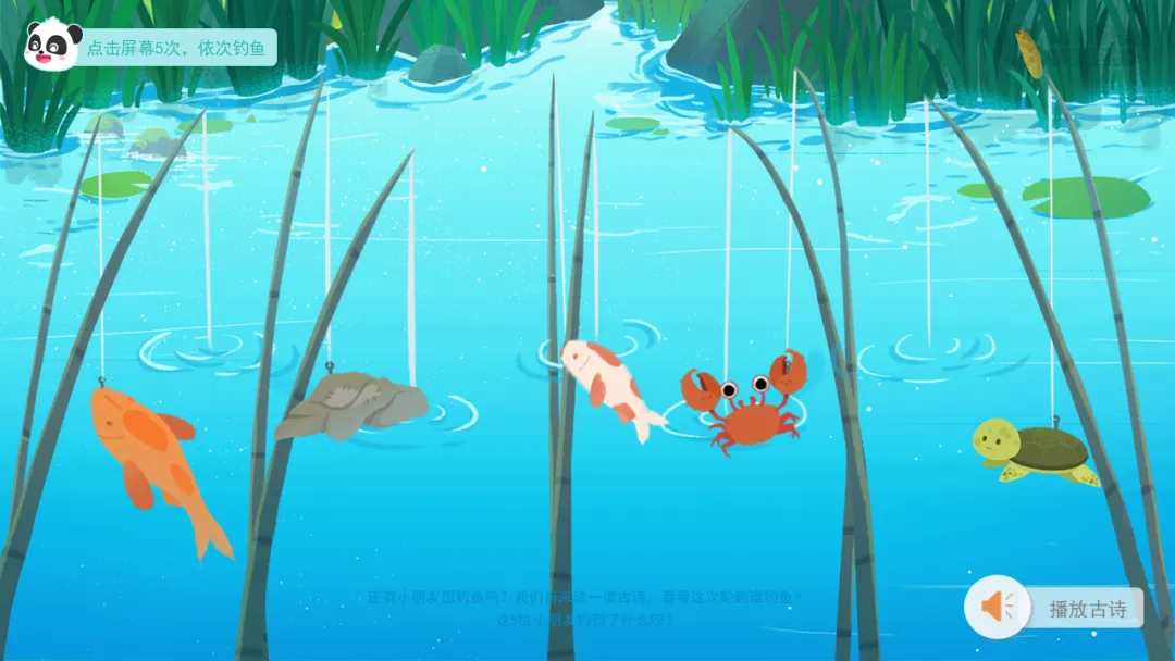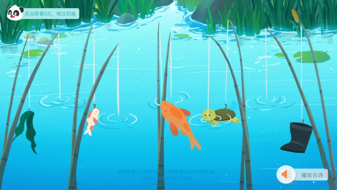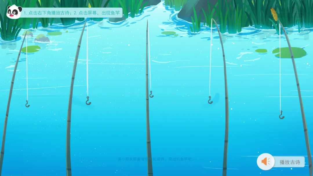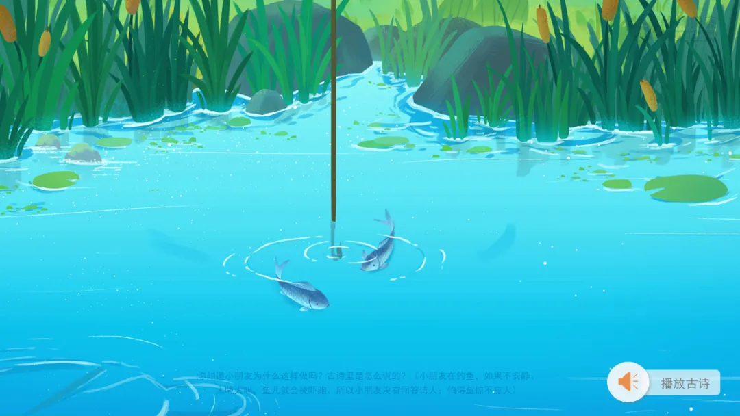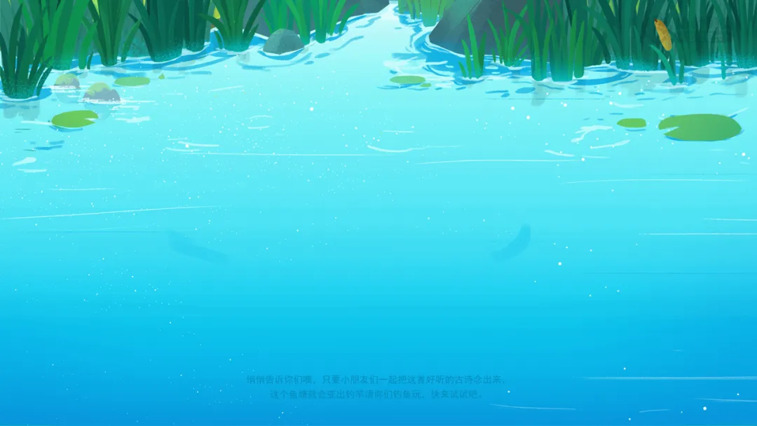 ——悄悄告诉你们噢,只要小朋友们一起把这首好听的古诗念出来,这个鱼塘就会变出钓竿请你们钓鱼玩,快来试试吧。