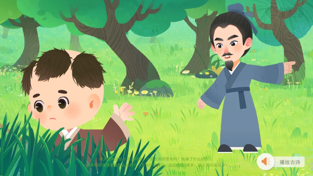——诗人想向这位小朋友问路,小朋友有回答他吗?他做了什么动作?一起来听听古诗里是怎么说的?(没有回答诗人;远远地招/摆手;路人借问遥招手)