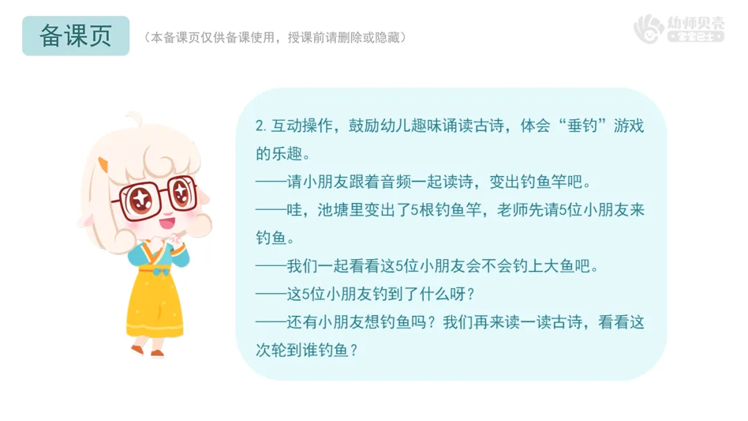 2.互动操作,鼓励幼儿趣味诵读古诗,体会“垂钓”游戏的乐趣。