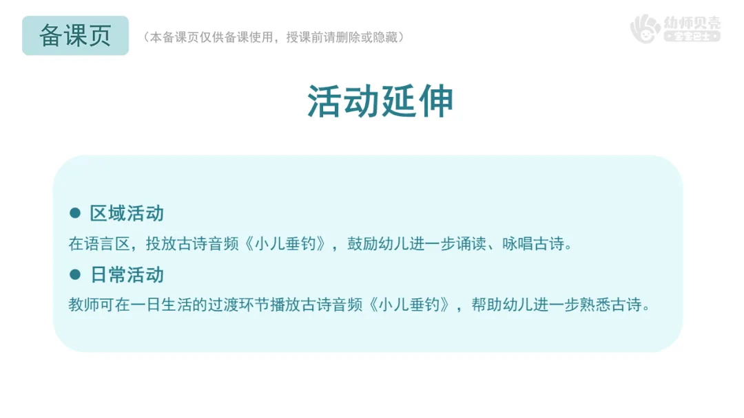 教师可在一日生活的过渡环节播放古诗音频《小儿垂钓》,帮助幼儿进一步熟悉古诗。