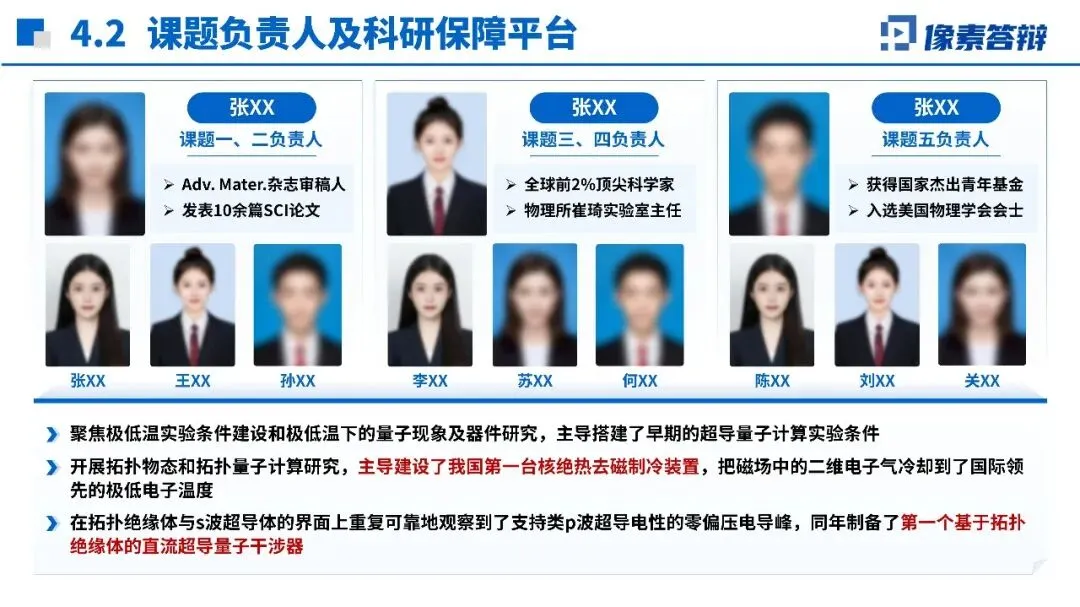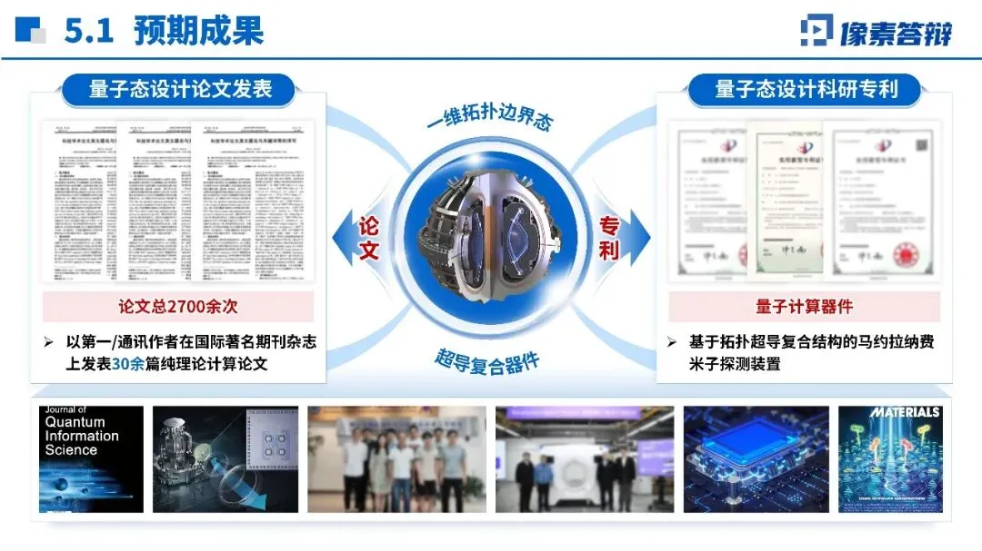 三. 视觉设计“专业感”:简+稳+一背景用纯白/浅灰,别用花哨渐变!配图选实景图(如量子芯片显微照片)或原理示意图,避免卡通装饰。字体统一:标题用黑体加粗,正文用宋体清晰。配色选蓝灰主调,局部用橙红点睛(如创新点标注)。每页角落可放量子符号小图标(如∣0⟩),细节显专业。