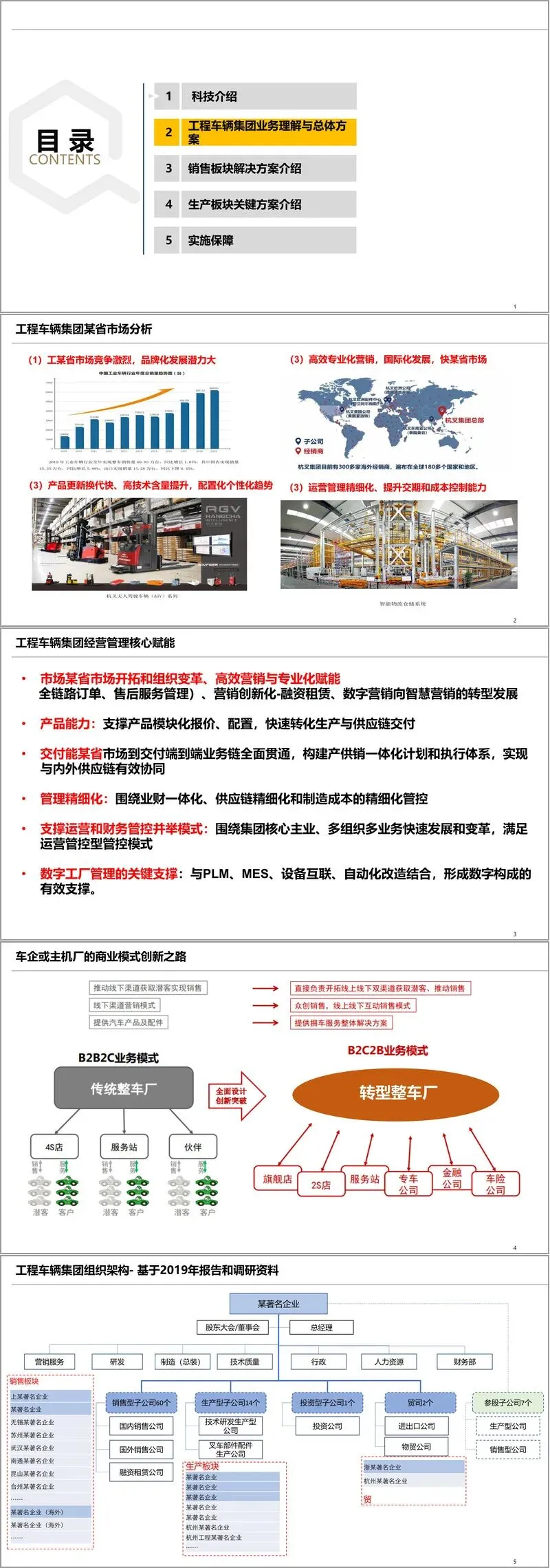 方案开篇先对工程车辆集团的业务现状进行了深入剖析。行业层面,2019 年工业车辆行业整车销量达 60.83 万台,国内市场增长显著但出口有所下滑,集团在全球拥有 300 多家海外经销商,业务覆盖 180 多个国家和地区。集团自身业务呈现产品更新快、个性化需求突出的特点,同时面临着市场竞争激烈、运营管理需精细化的挑战。组织架构上,集团拥有销售型、生产型、投资型等各类子公司,业务涵盖研发、制造、营销服务等多个领域,形成了复杂的集团化运营模式。