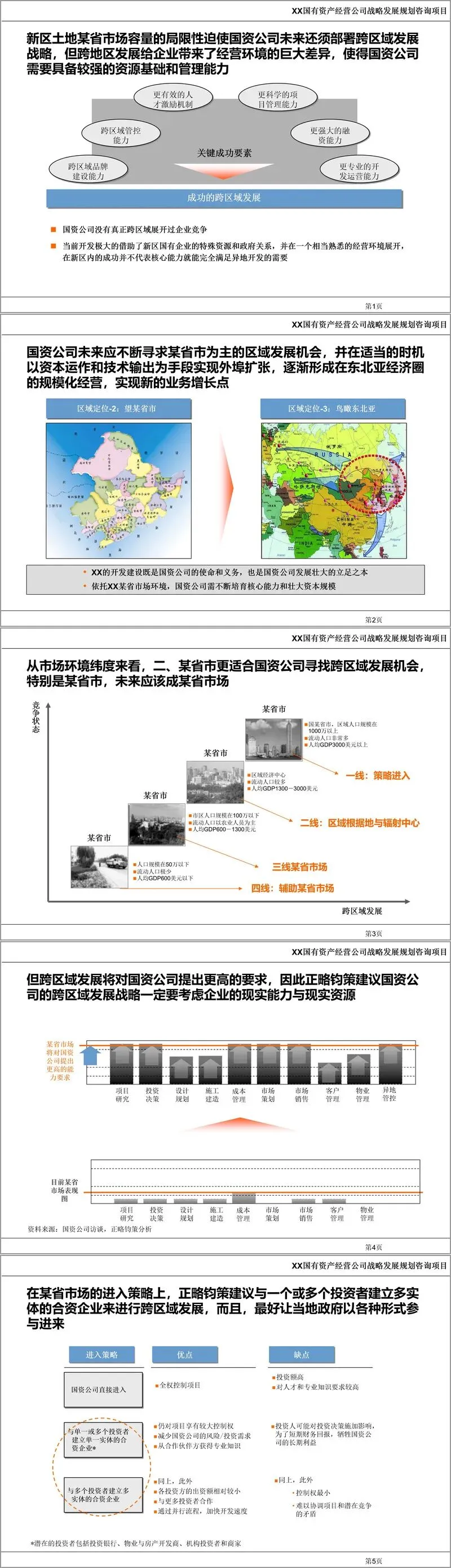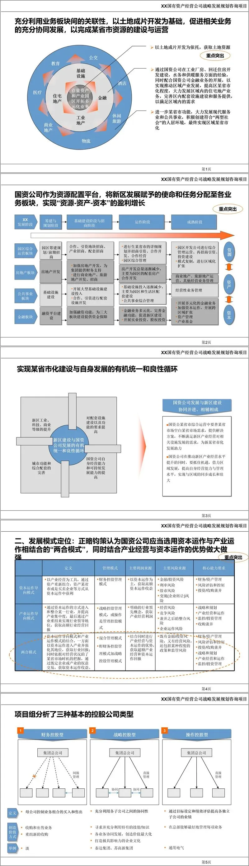 总体战略明确了公司愿景与使命,愿景是成为以城市综合开发运营为重心的国内一流国有大型投资控股集团,使命是成为推动 XX 经济发展和国有资产保值增值的平台。战略定位涵盖区域、功能、发展模式、业务四个维度,区域上立足新区、放眼省市、鸟瞰东北亚;功能上承担资源配置、融资、资本运作三大主体职能;发展模式采用资本运作与产业运作相结合的 “两合模式”,实行 “内涵式发展 + 外延式扩展” 双轮驱动;业务上以房地产和园区综合运营为核心,金融和公共事业为协同,实业投资为新增长点。战略目标分三阶段推进,计划至 20XX 年业务收入突破 100 亿元,20XX 年接近 150 亿元。