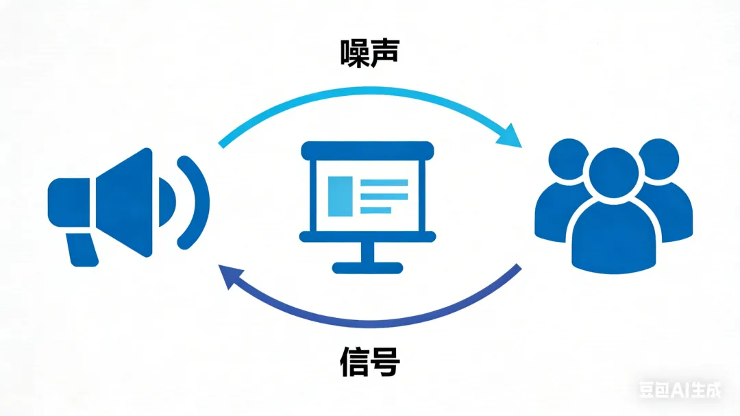 编码 - 解码失配。 信息论里有个核心概念:编码和解码必须使用相同的密钥。演讲者编码时用的密钥是"这页 PowerPoint 的核心是第二行数据",听众解码时用的密钥是"这页 PowerPoint 字太多不想看"。密钥不匹配,信息就失真了。