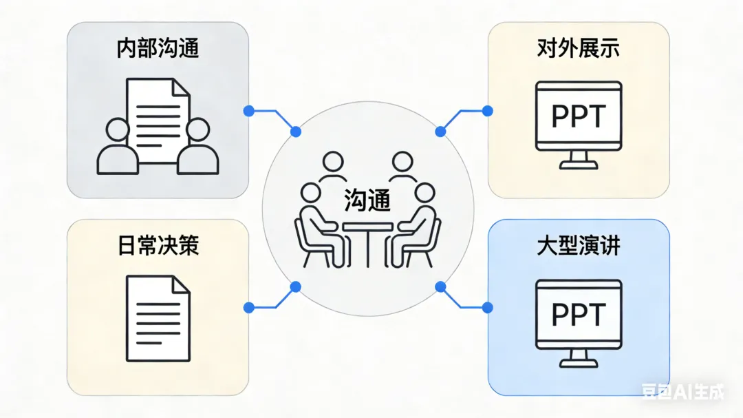 对外沟通时,面对客户、投资人、合作伙伴,PowerPoint 是一种"正式感"的载体——它传递的不仅是信息,还有态度:"我重视这次沟通,所以我花了时间准备。"大型演讲也是如此,TED 演讲、行业峰会、全员大会,听众几百上千人,信息需要高度浓缩和视觉化,这时候 PPT 比文档更合适。