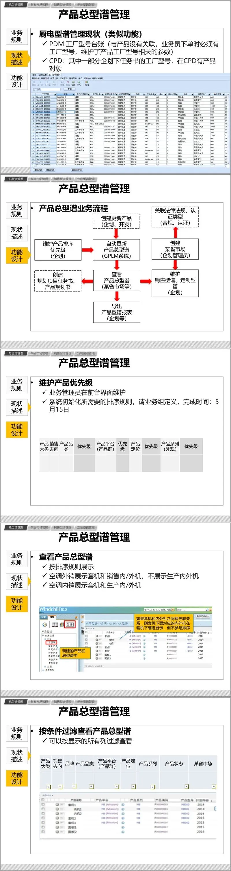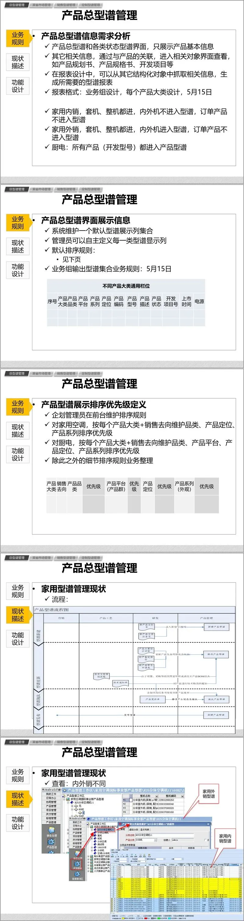 产品型谱管理是核心模块,覆盖研究、开发、销售、投标、淘汰等多类型谱。核心要求是实现全系统统一管理与发布,打通销售和财务系统的数据链路,按产品状态(如储备、在售、冻结、退市等)实行差异化管理,并支持自定义生成投标型谱。型谱分类以“产品大类 + 销售去向 + 状态” 为规则,明确内销、外销及厨电等不同品类的纳入标准,同时通过分级授权保障不同使用者的信息获取权限。